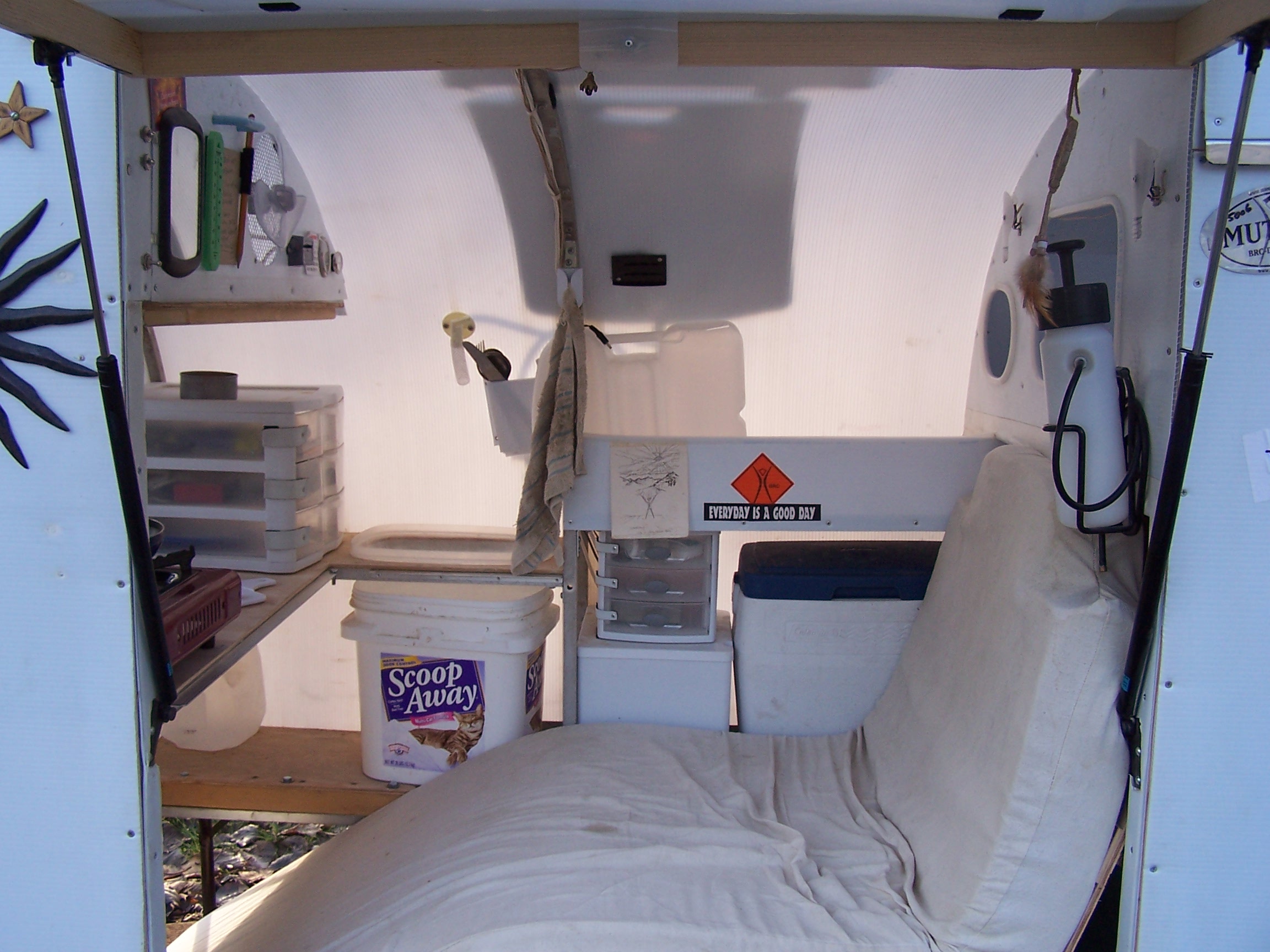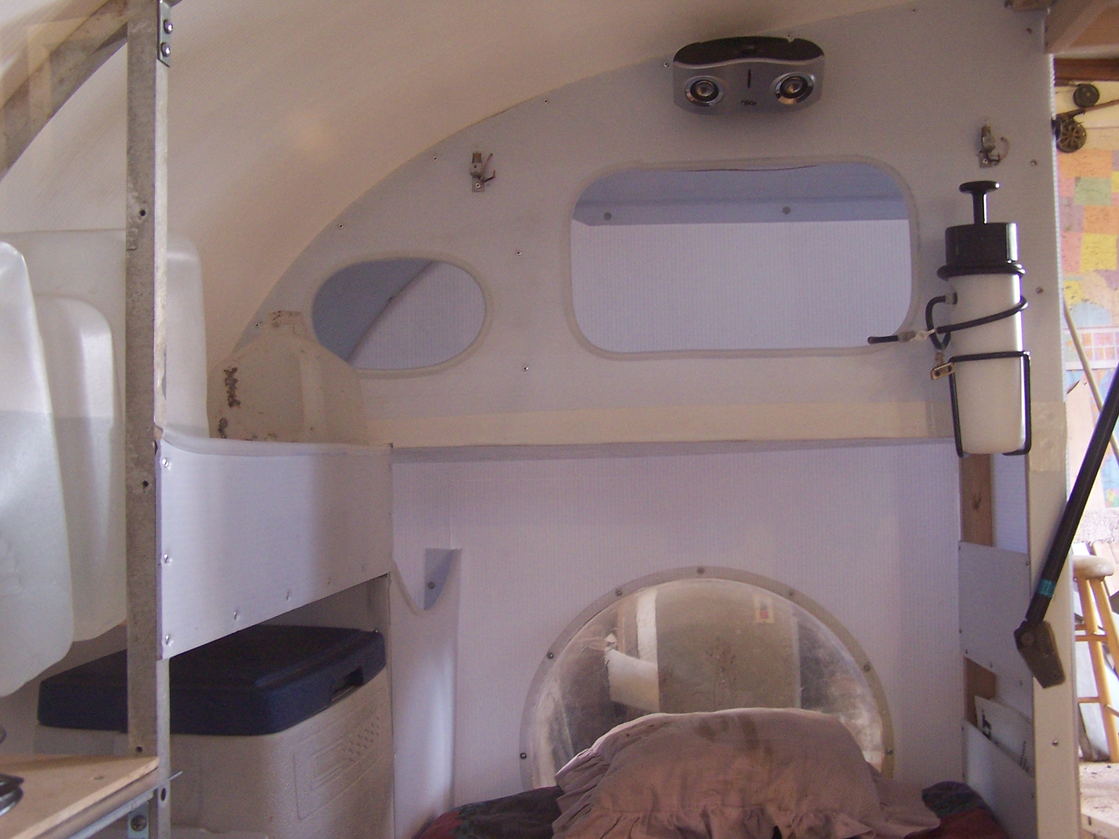 Left to right, 2-1/2 gallon water jug, misc. storage self, cooler, clothes hamper bubble for head. Above, clothes storage, mp3 speakers, lights and mister. Below that, magazine rack.