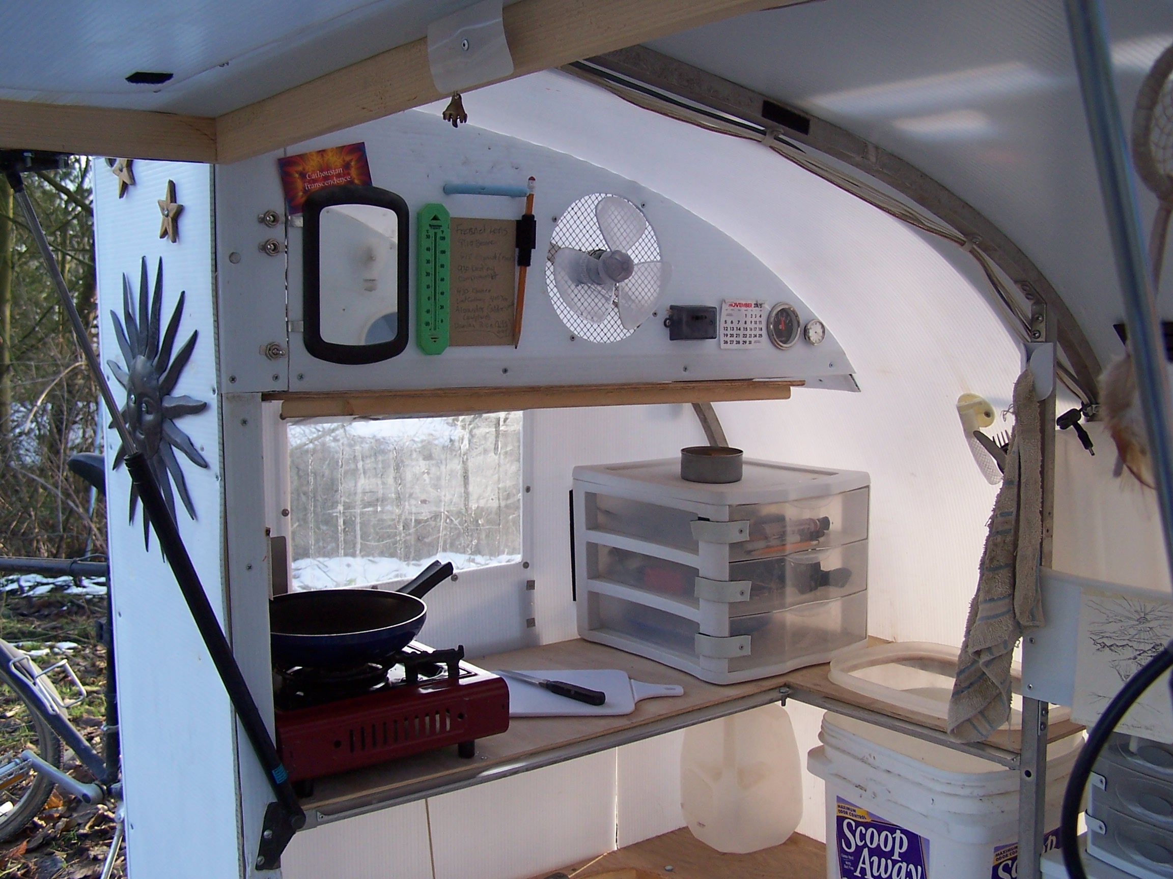 Left to right, above, food storage, mirror, fan, volt meter. Below, butane stove (for convenience. I was looking into solar stove) storage bins,