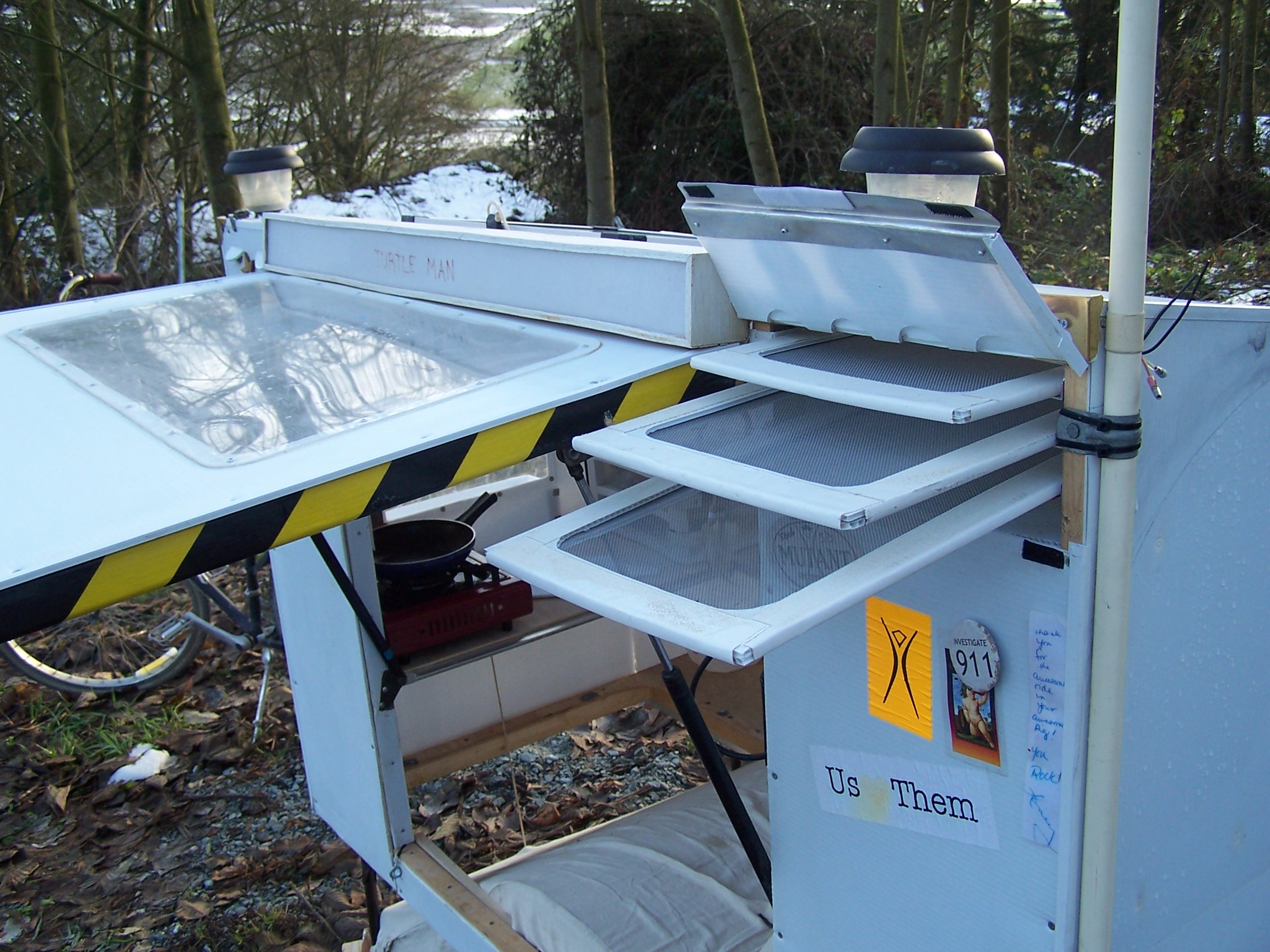 Left to right, Solar window for food dehydrator, solar hot water bag for exterior shower and plumbed to interior sink. Photo voltaic 5 watt panel,