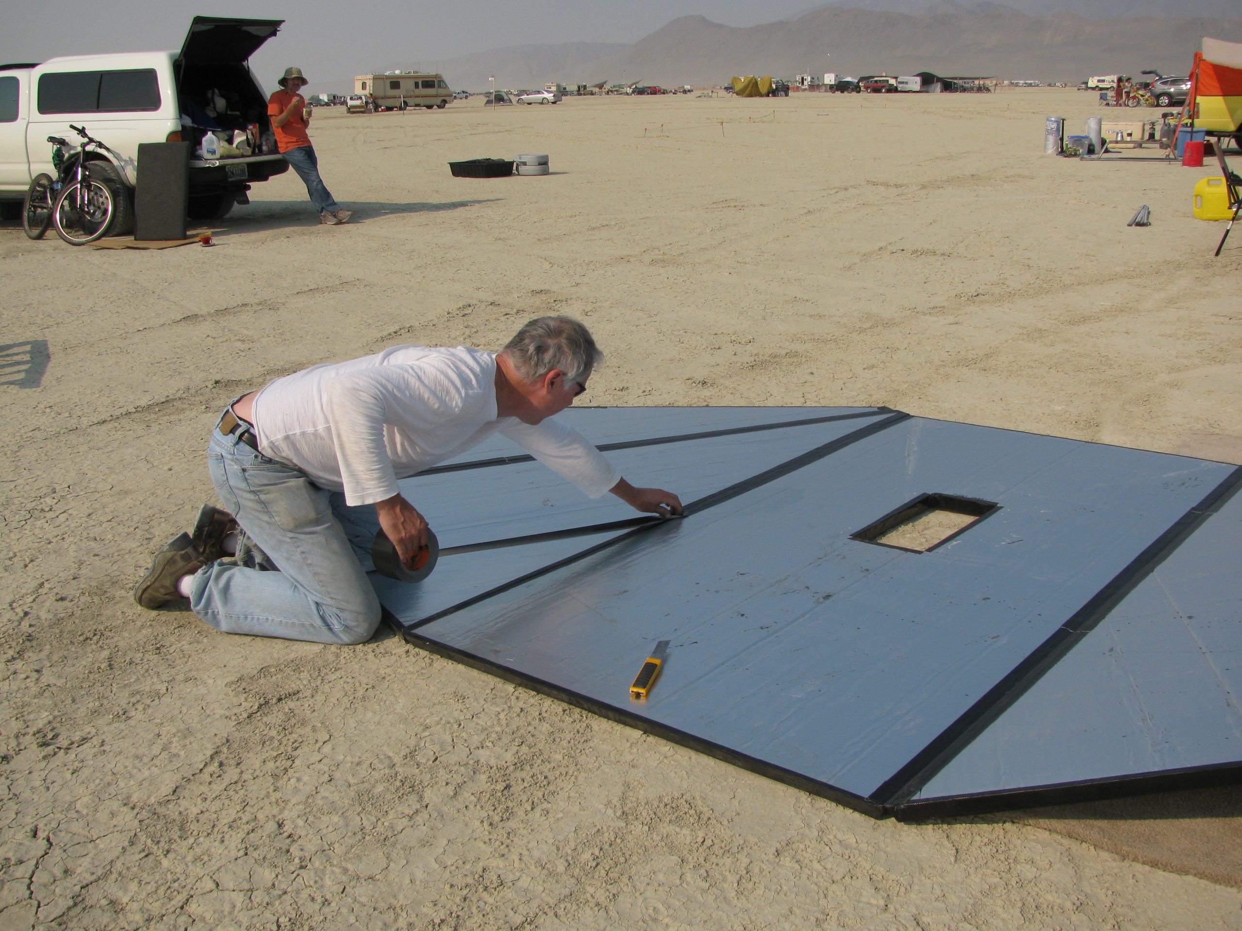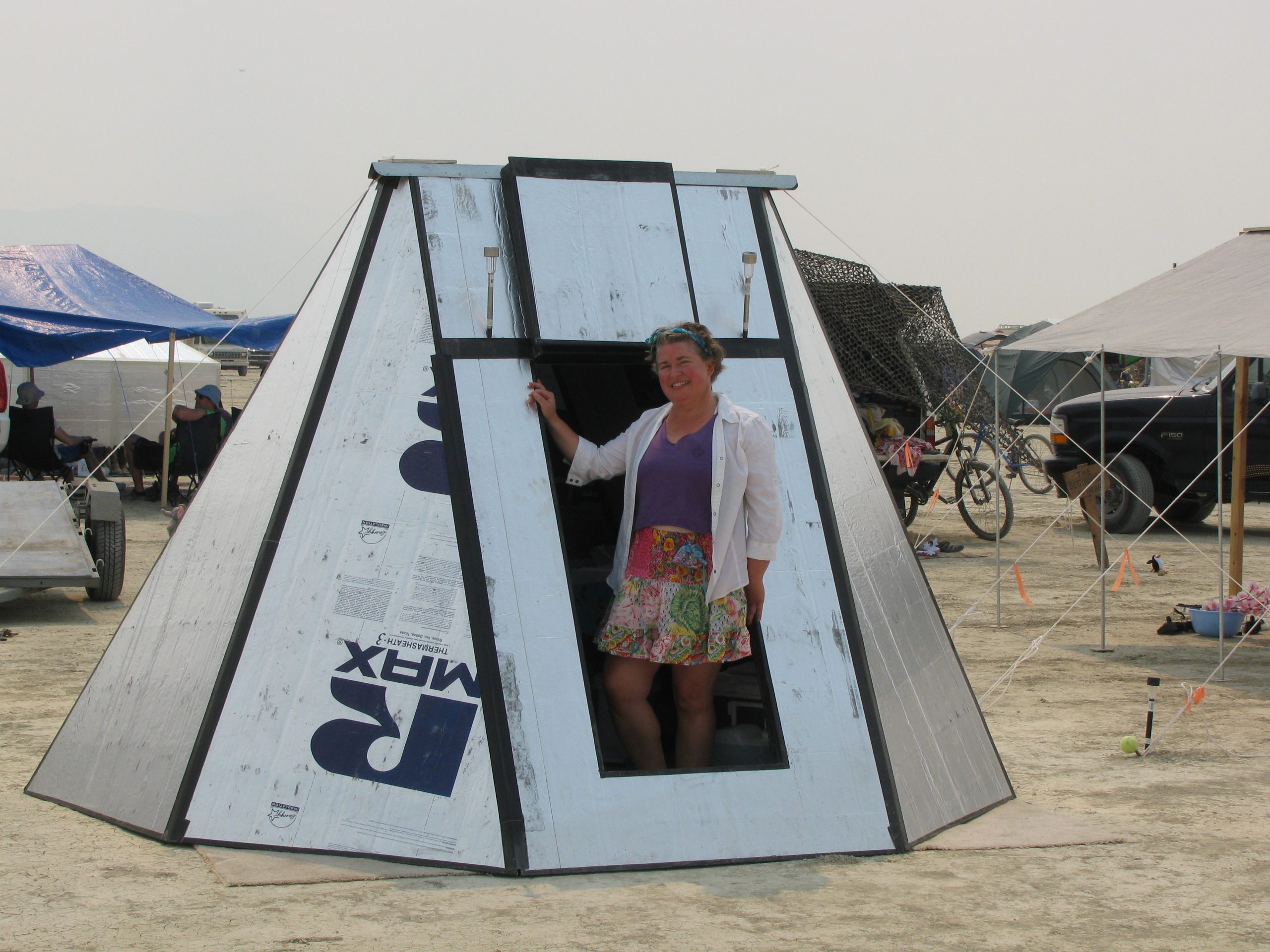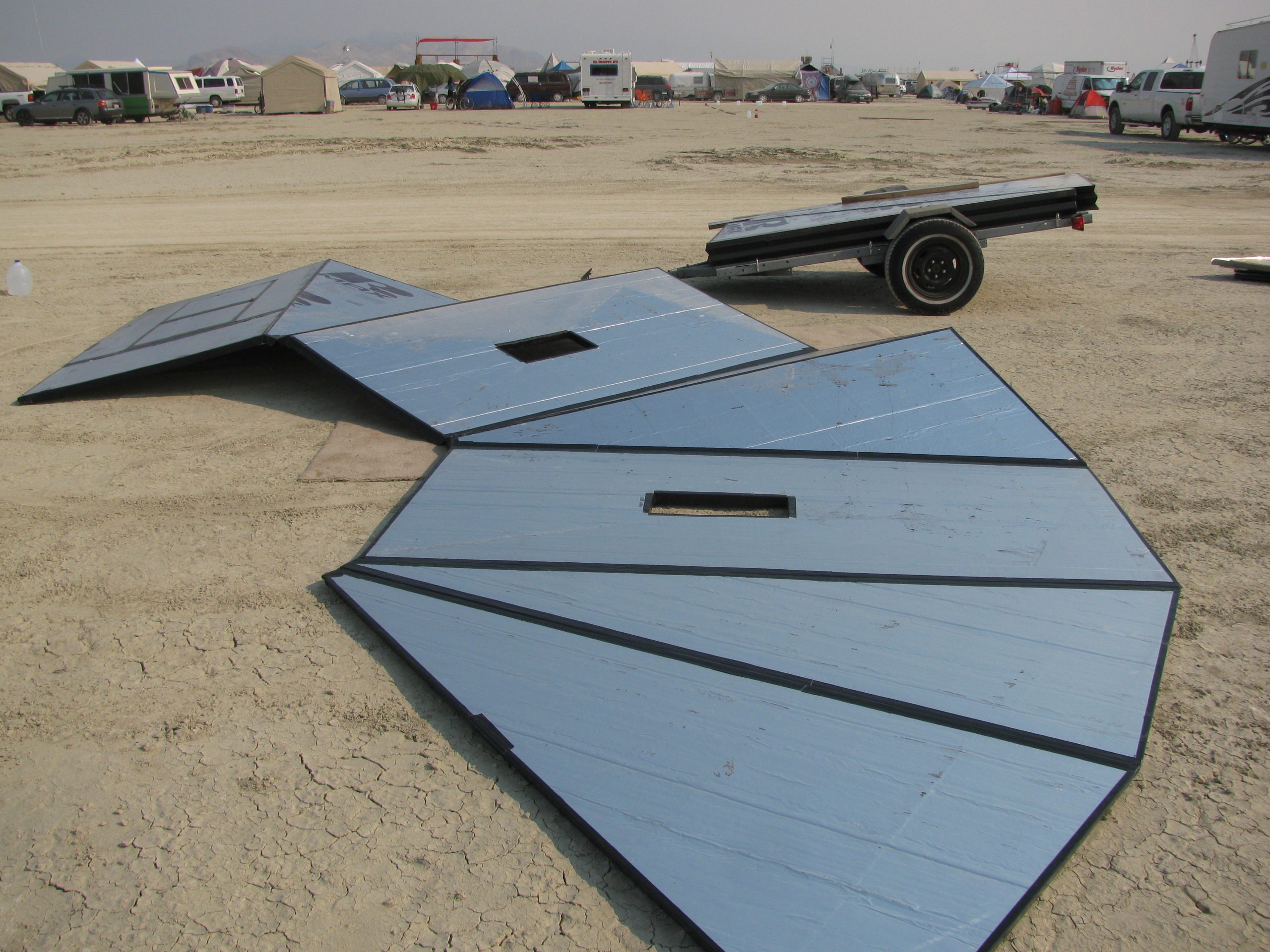The 1″ thick Pyramid from the year before proved a little time consuming to erect, so I came up with this quick deployment 9 sided shelter using 1-1/2″ thick foam board.