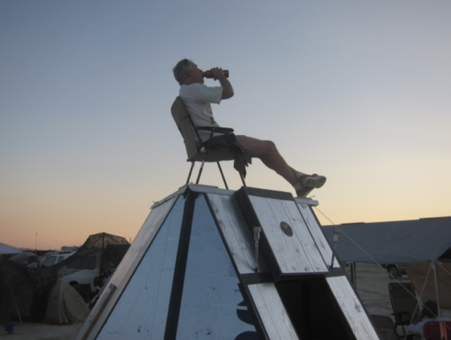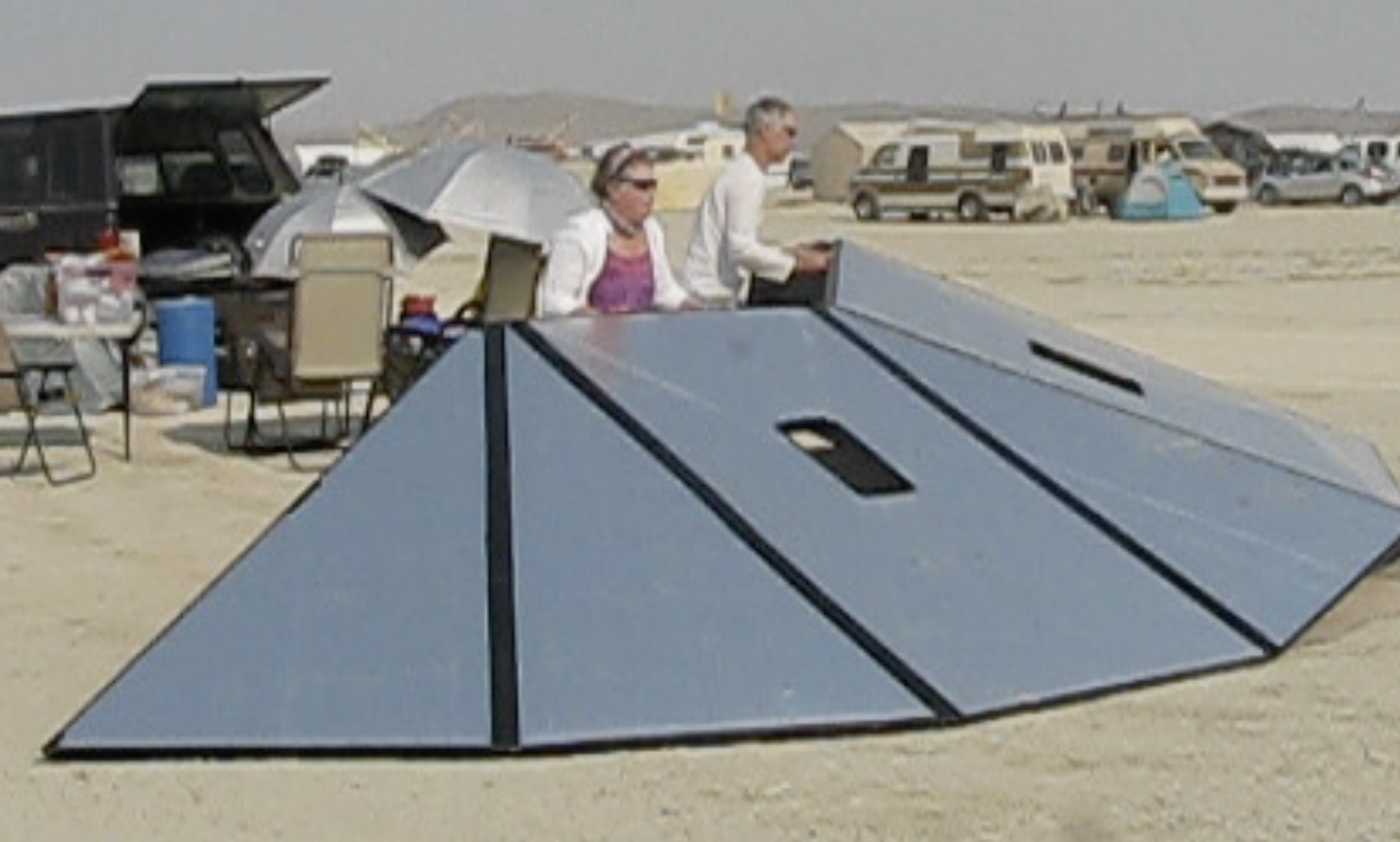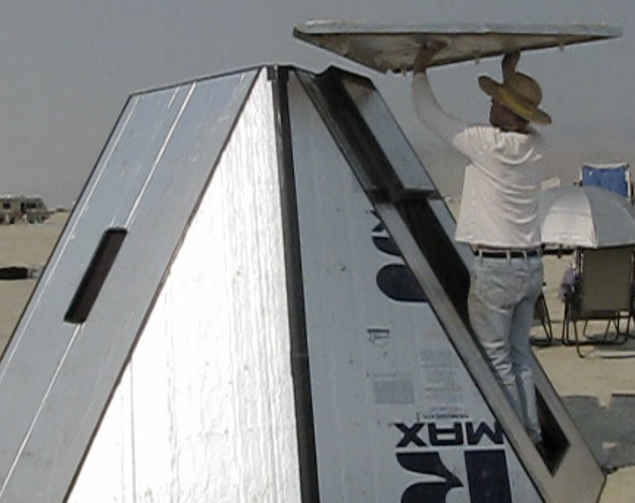 The 1″ thick Pyramid from the year before proved a little time consuming to erect, so I came up with this quick deployment 9 sided shelter using 1-1/2″ thick foam board.