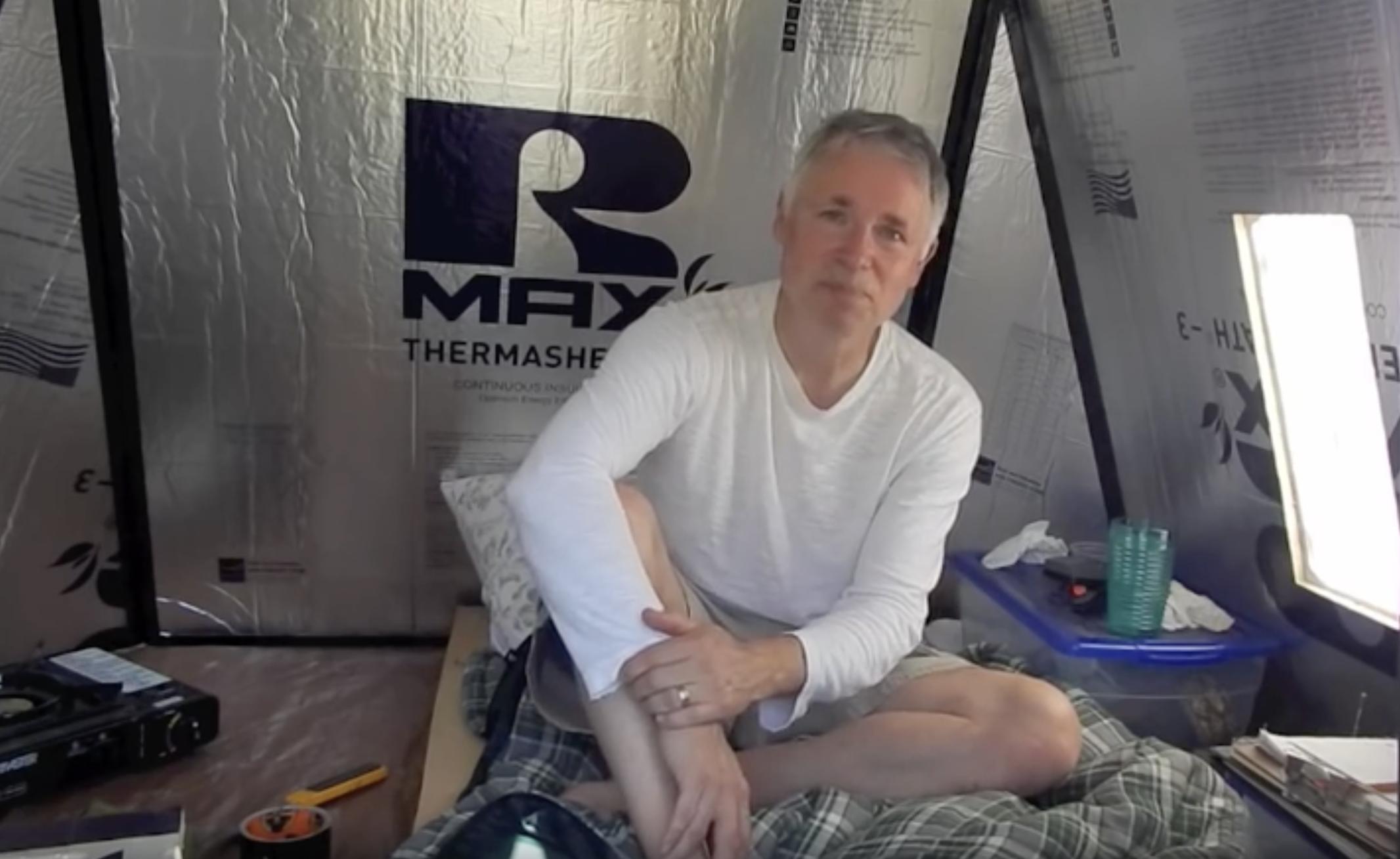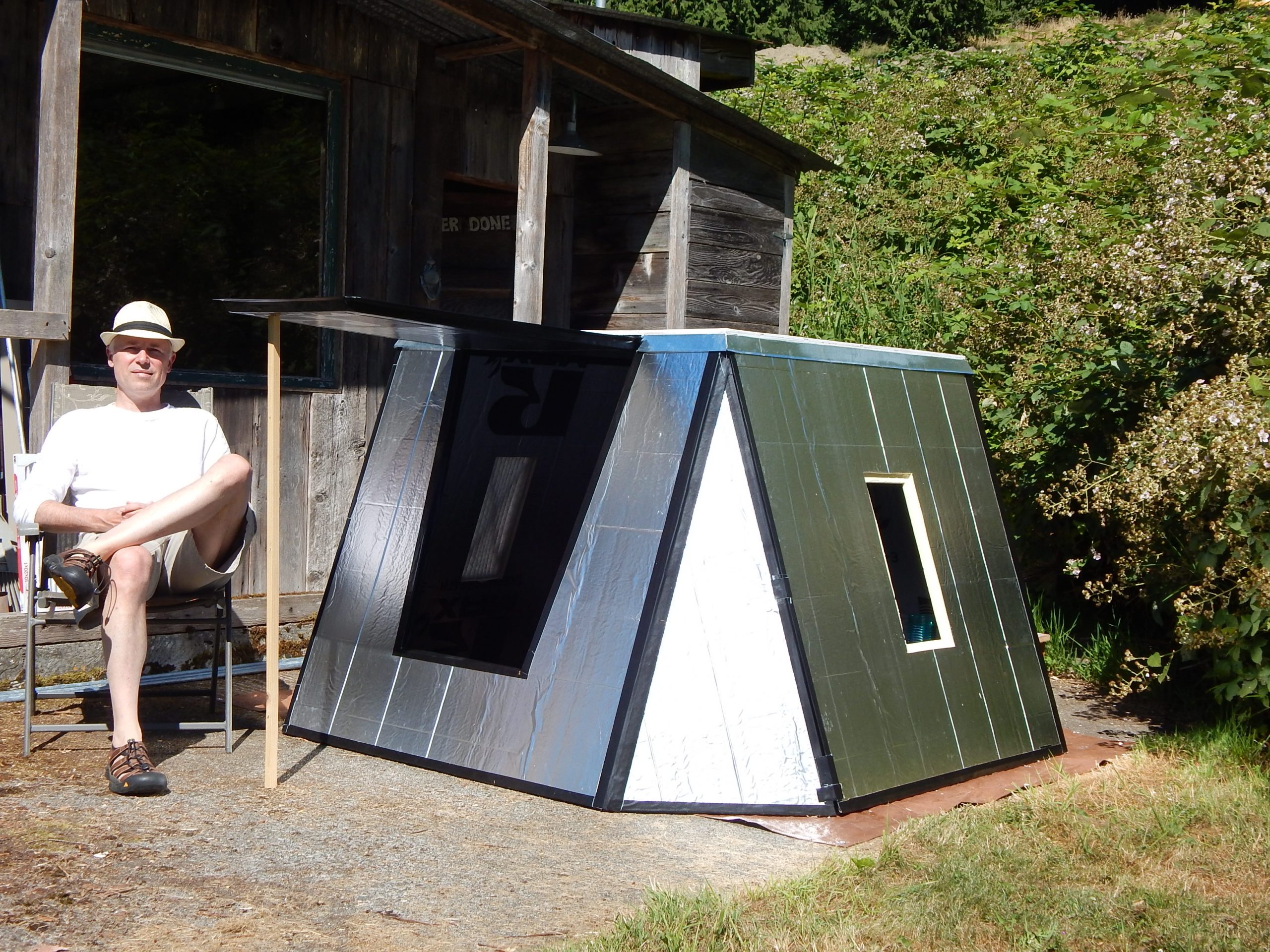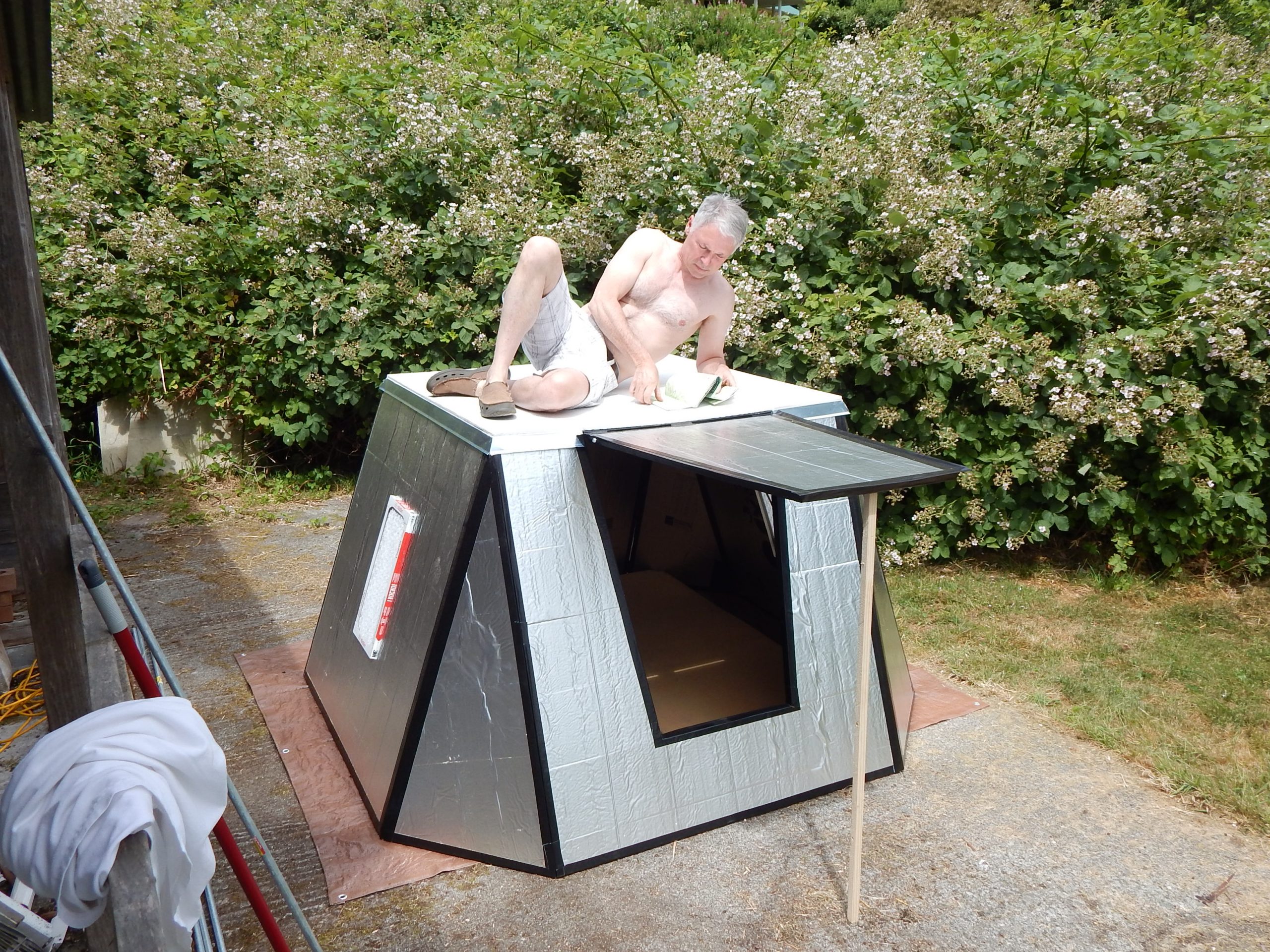 This 3 sheet 1″ thick Gorilla duct taped shelter hasn’t made it to Burningman, but was designed for playa use. Having a plywood top creates anchoring points for tie down lines,