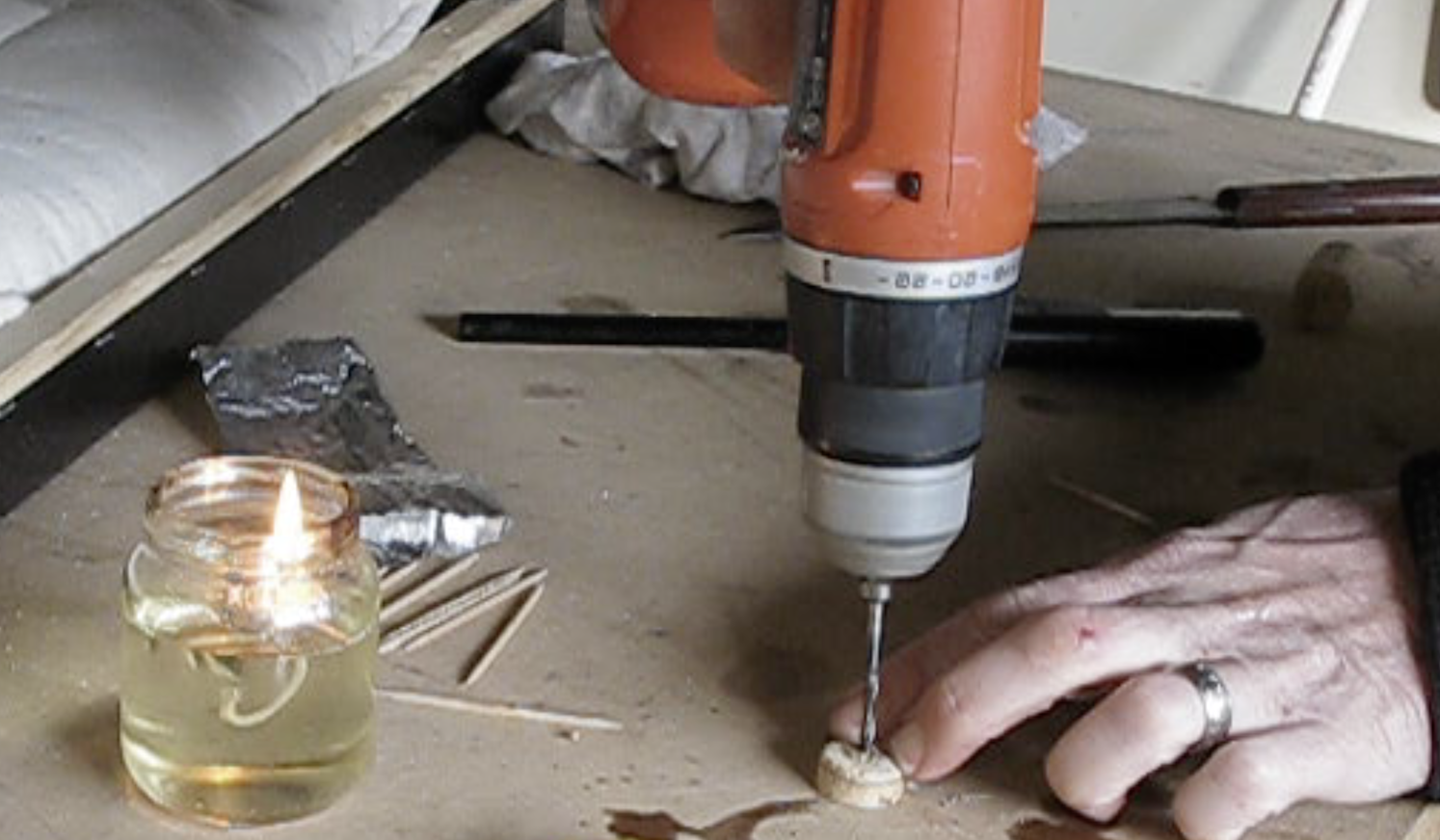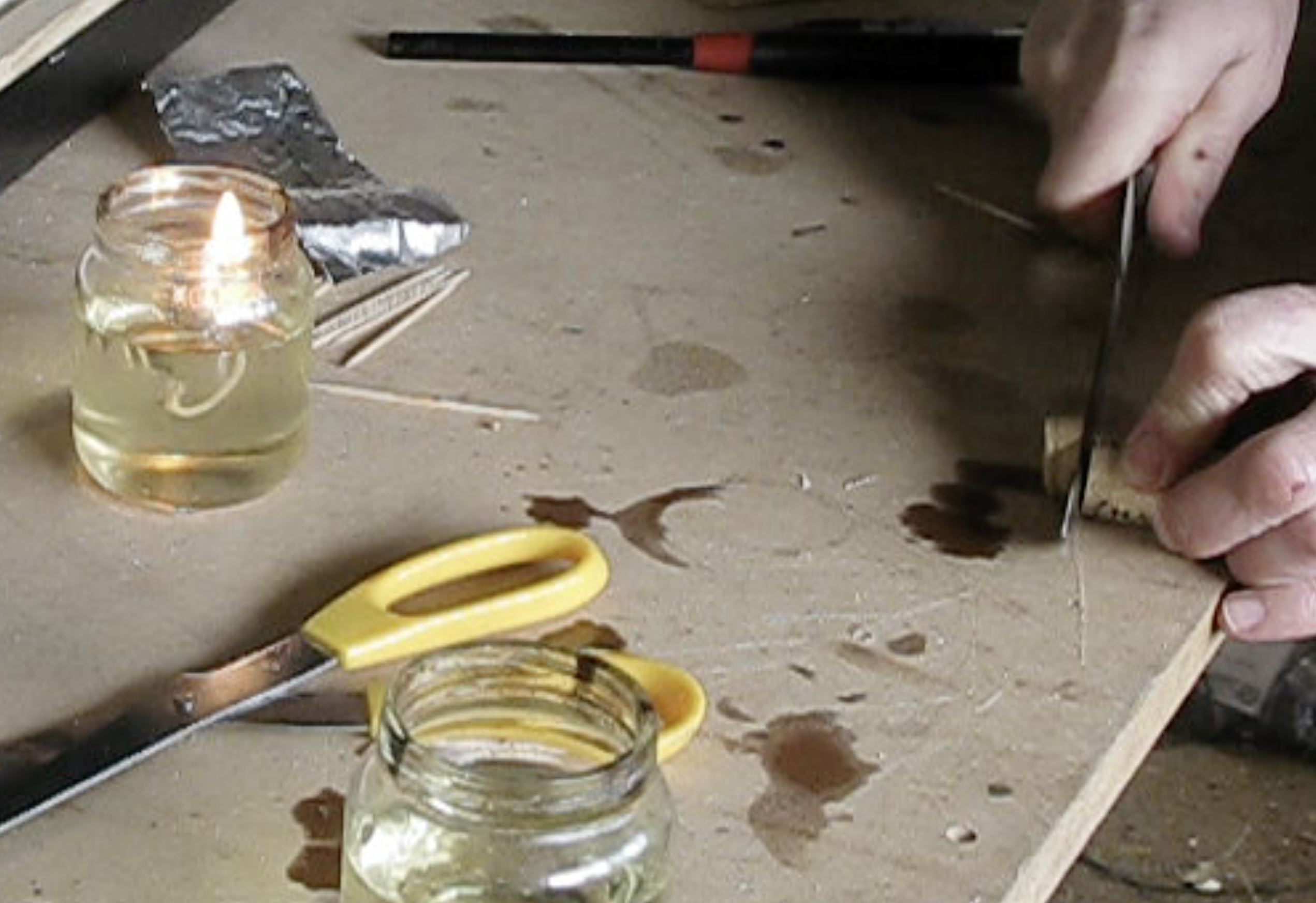 To make the you first need a floating wick. I used a small 3/8″ length of wine cork.