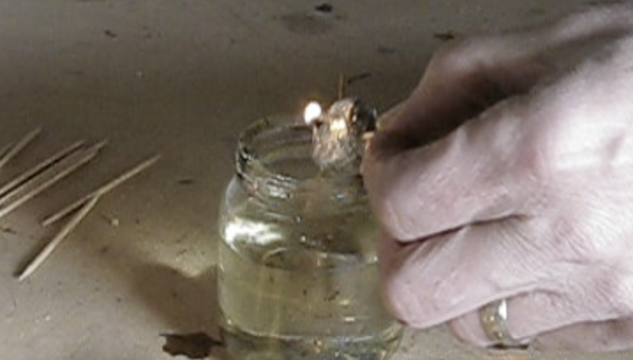 I threaded a two inch length of cotton wick string thru the hole, then inserted three toothpicks in the sides of the cork to center the wick in the jar.