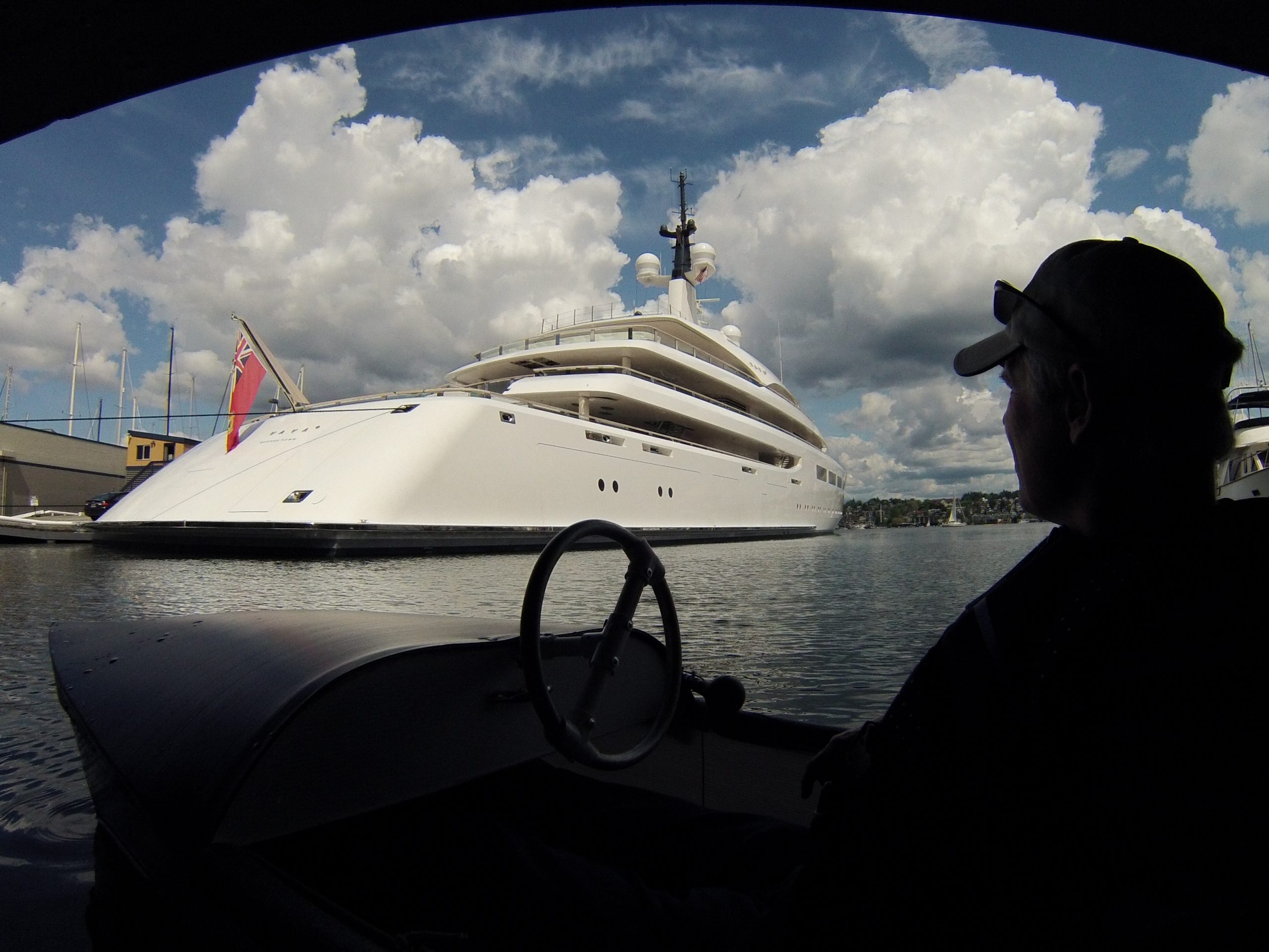 Here I am sitting in the smallest motor boat on the lake looking at the biggest motor boat on the lake.