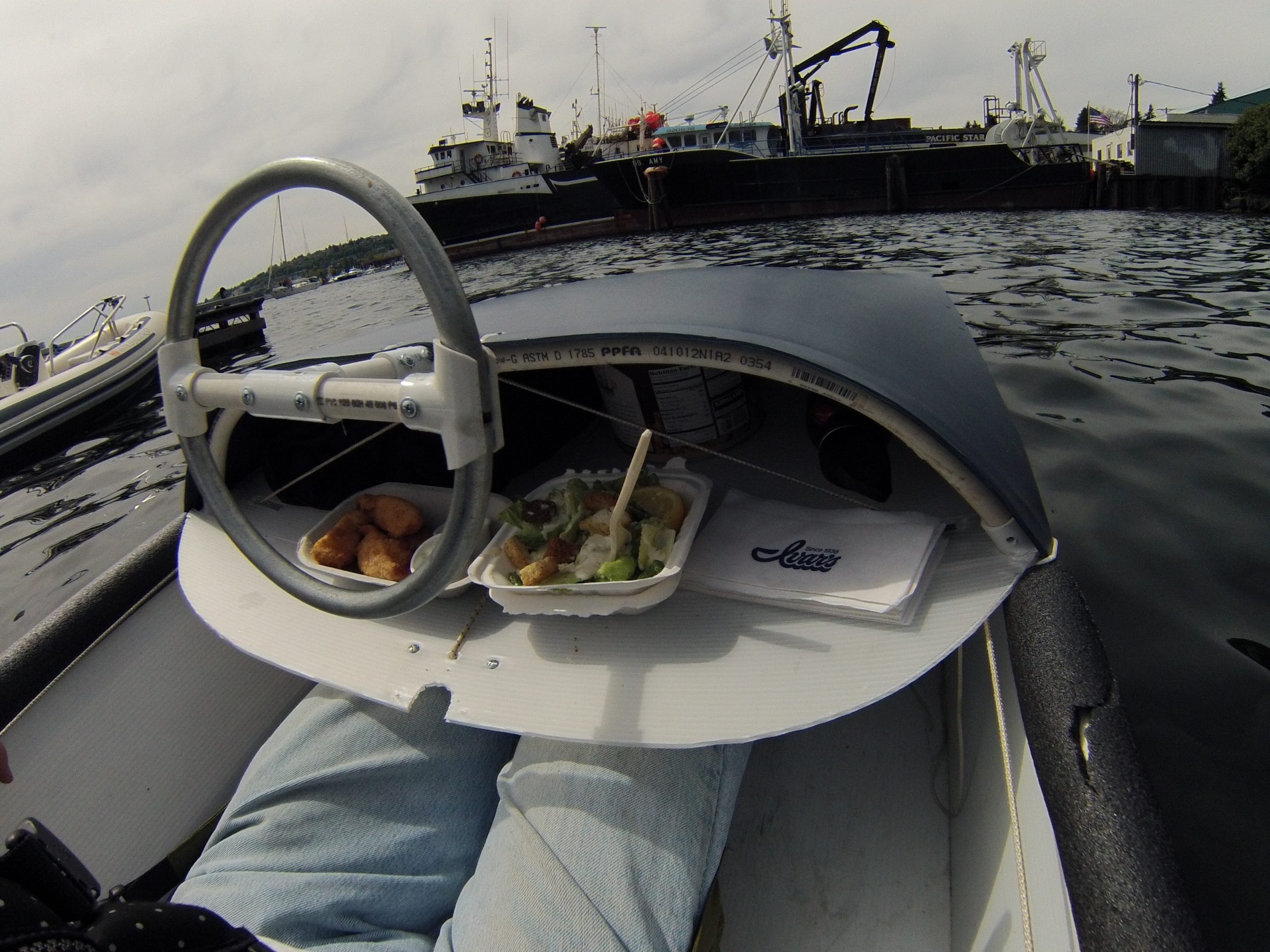 The storage lid also comes down and acts as a tray for eating lunch on the water. I really like this option. Mmmm. Ivars fish and salad. I get it every visit here.