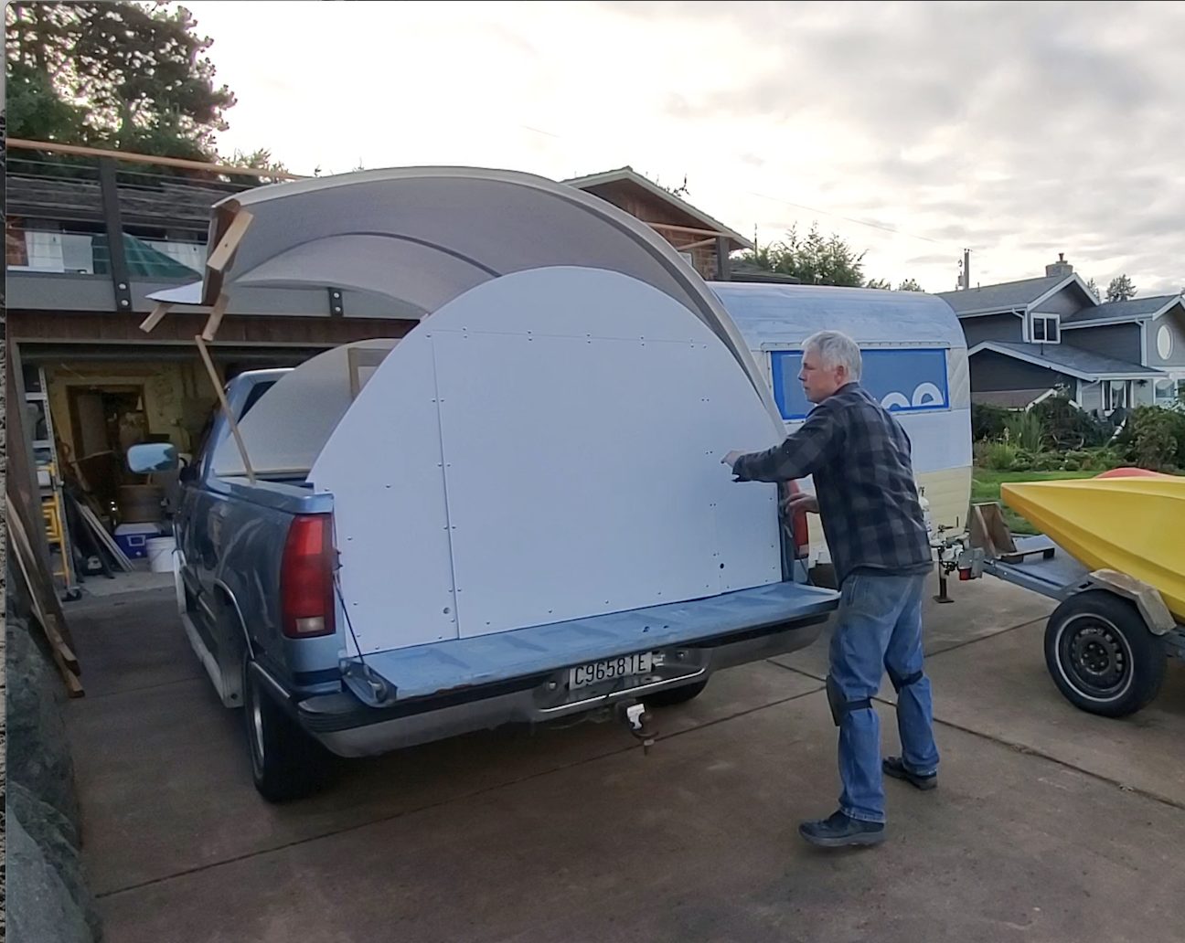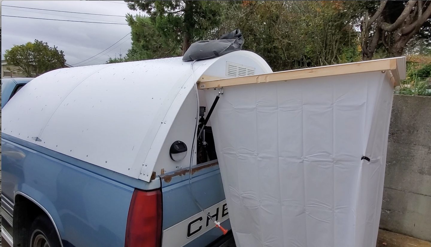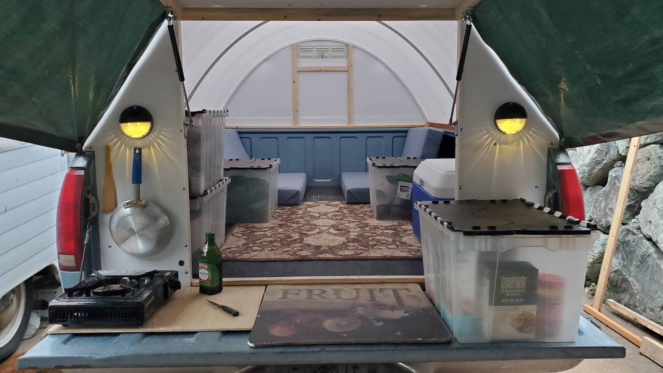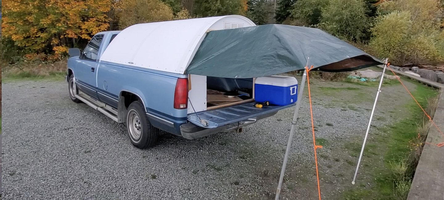 The Coro canopy is a rapid deployment truck bed cover that can be used for keeping hauled items dry or, as seen here, made into a summer camper.
