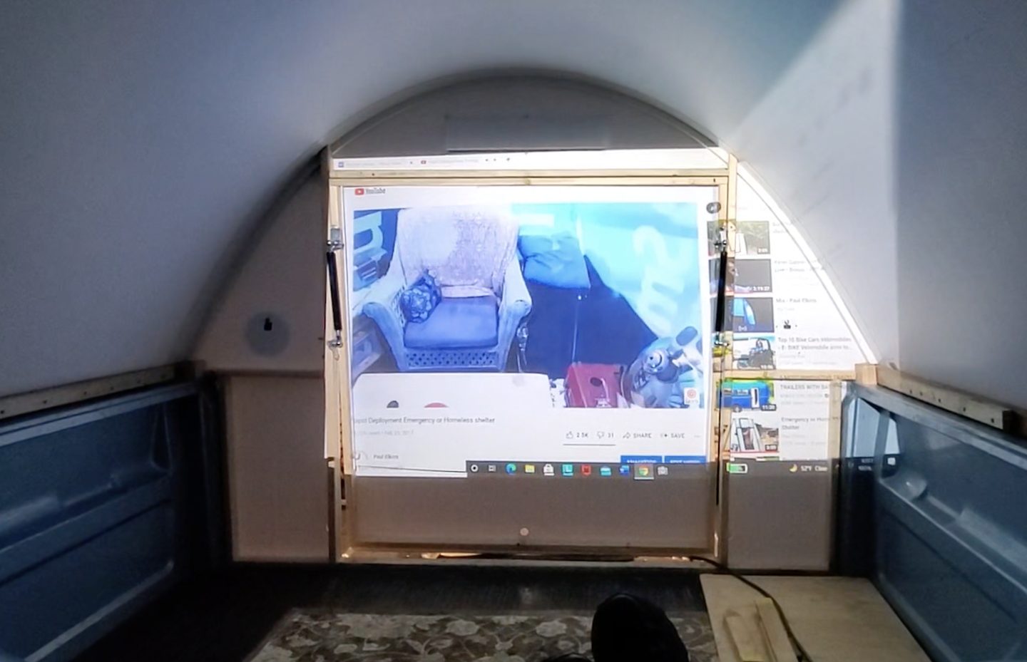 With a small projector you can transfer your cell phone or laptop downloaded movies on the door. Here I’m watching a Youtube video.