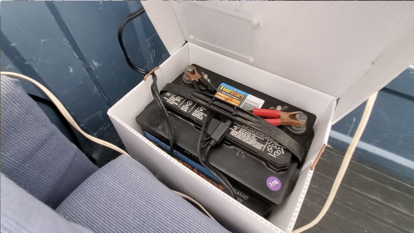 My deep cycle battery resides in a fluted plastic box I made from the left over scraps. The box breaks down and folds flat, then stores between the roof sheets.