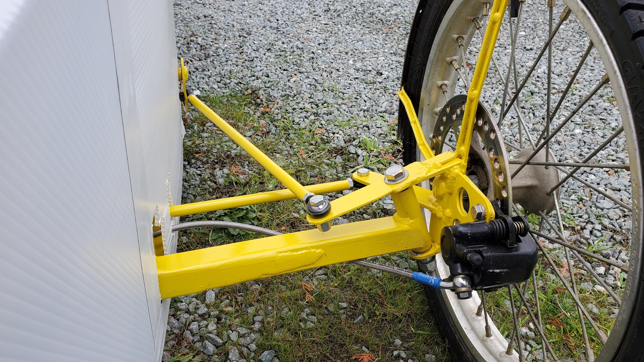 Borrowing ideas from Dale Malewicki’s California Commuter trike plans, I fashioned a basic rigid front swing arm. This helps stabilize the trike in corners