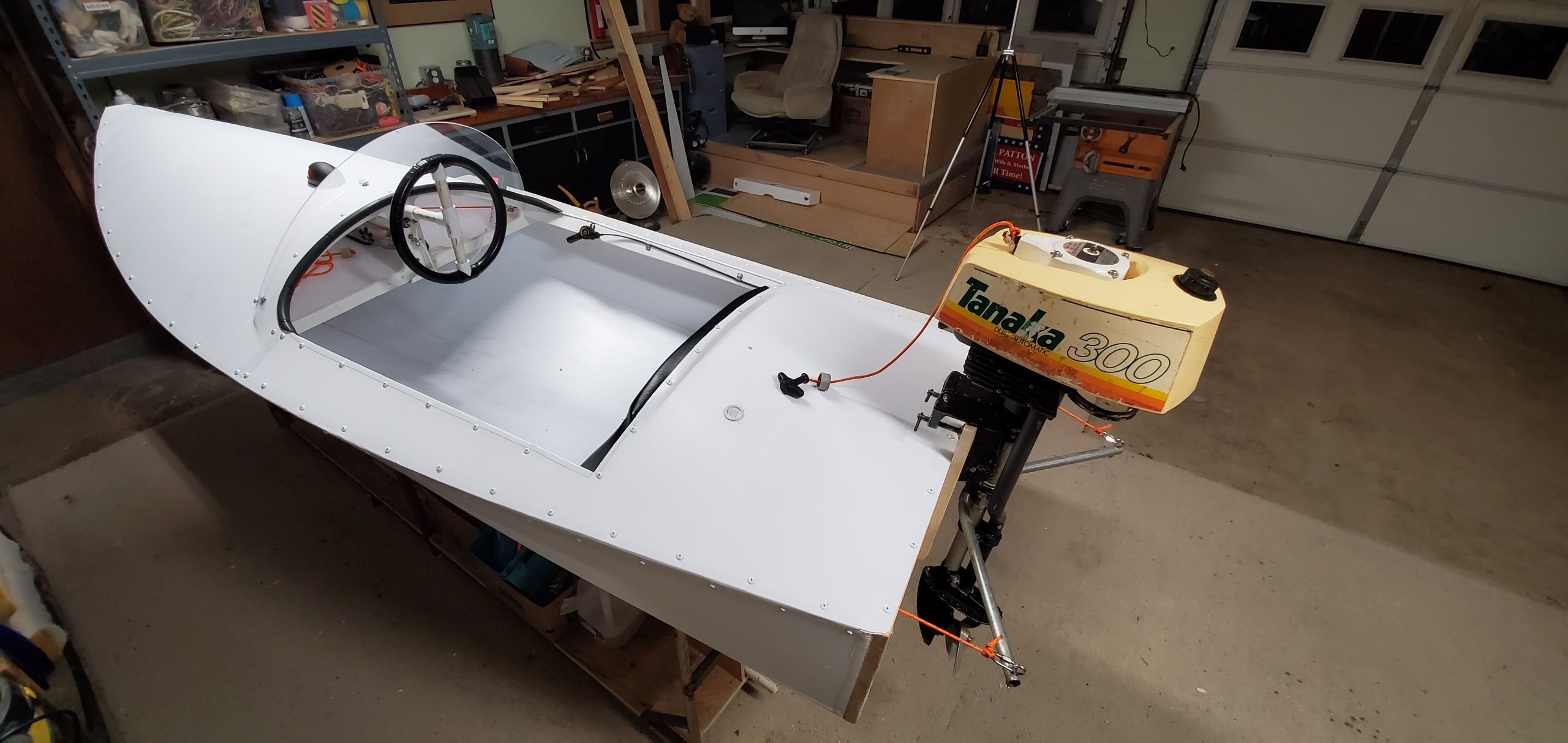 On this second version, which I show all the steps to build it on my youtube channel, I extended the hull 9″ and added a wood transom. All this to accommodate my heavier Tanaka 3hp 2 cycle loud as hell motor. Once I learned to get it to plane I was reaching 9 miles an hour.