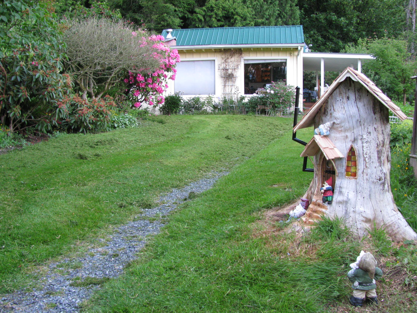 This was a diseased tree that was also uprooting my cement path. I had to cut down. Five years later I decided to turn the stump into a Gnome home.