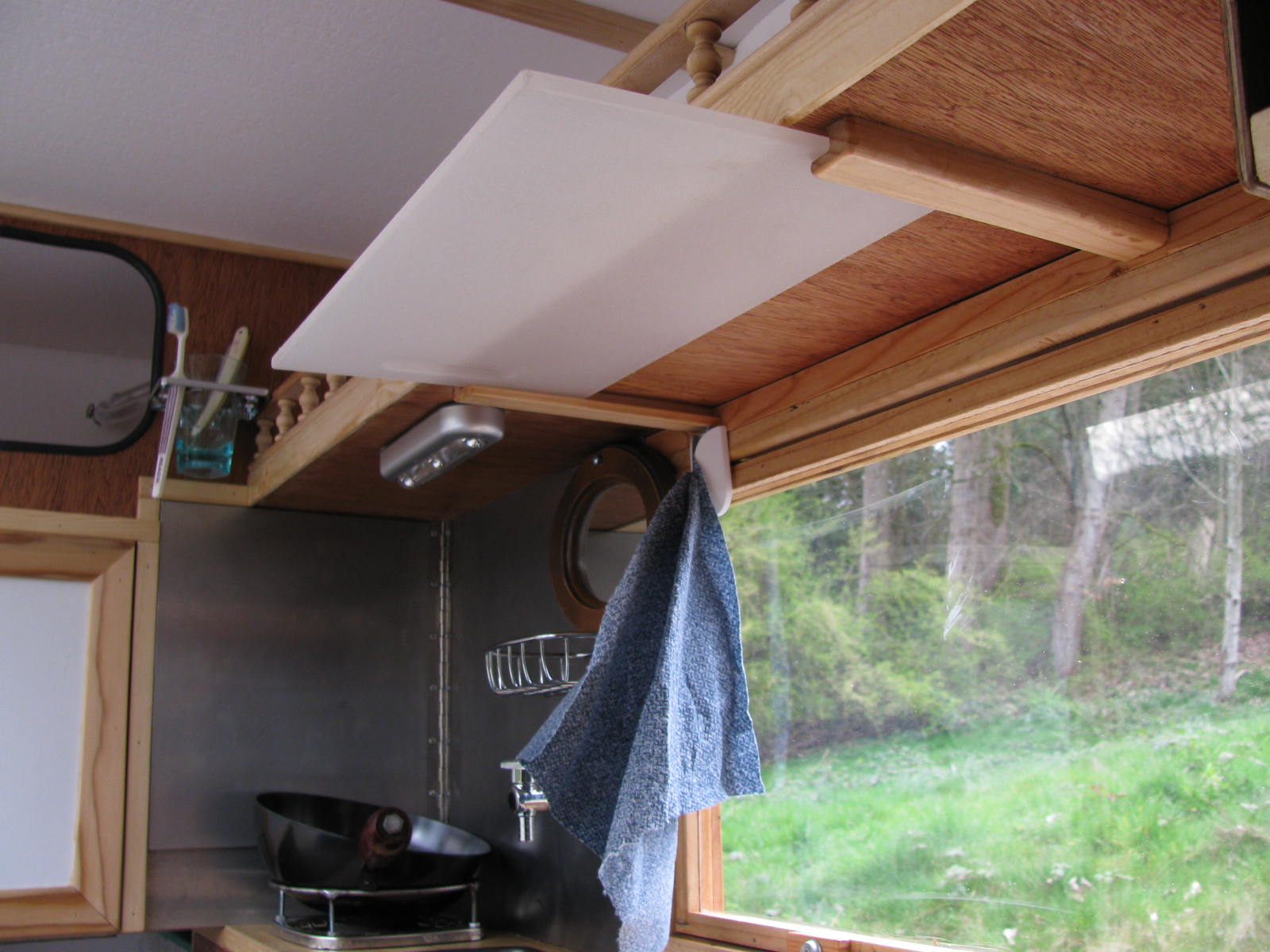 From left, the hatch that turns into a table top, the water jug access door, the cooler door, window and laundry door in the open position.