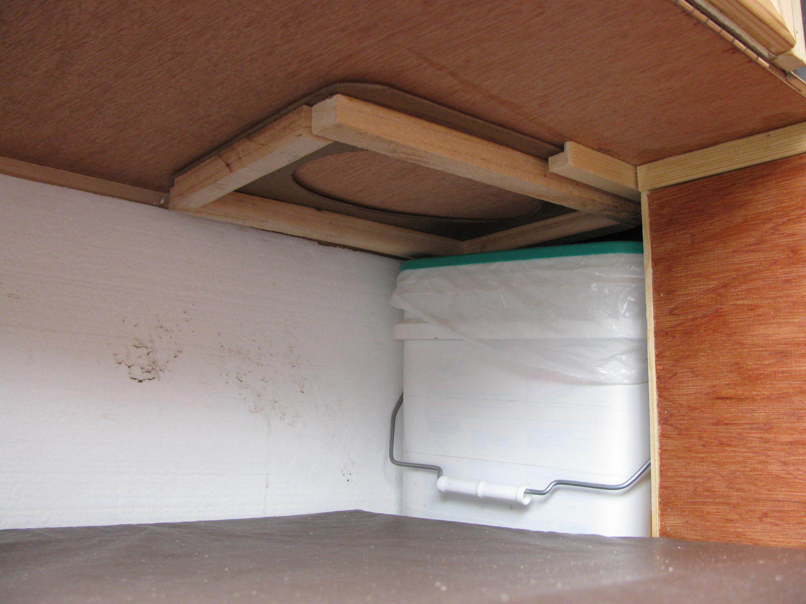 From left, toilet, kitty litter, propane stove, trash can liner, extra propane, trash can, (sink above) extra paper towel and toilet paper and a built in cooler.