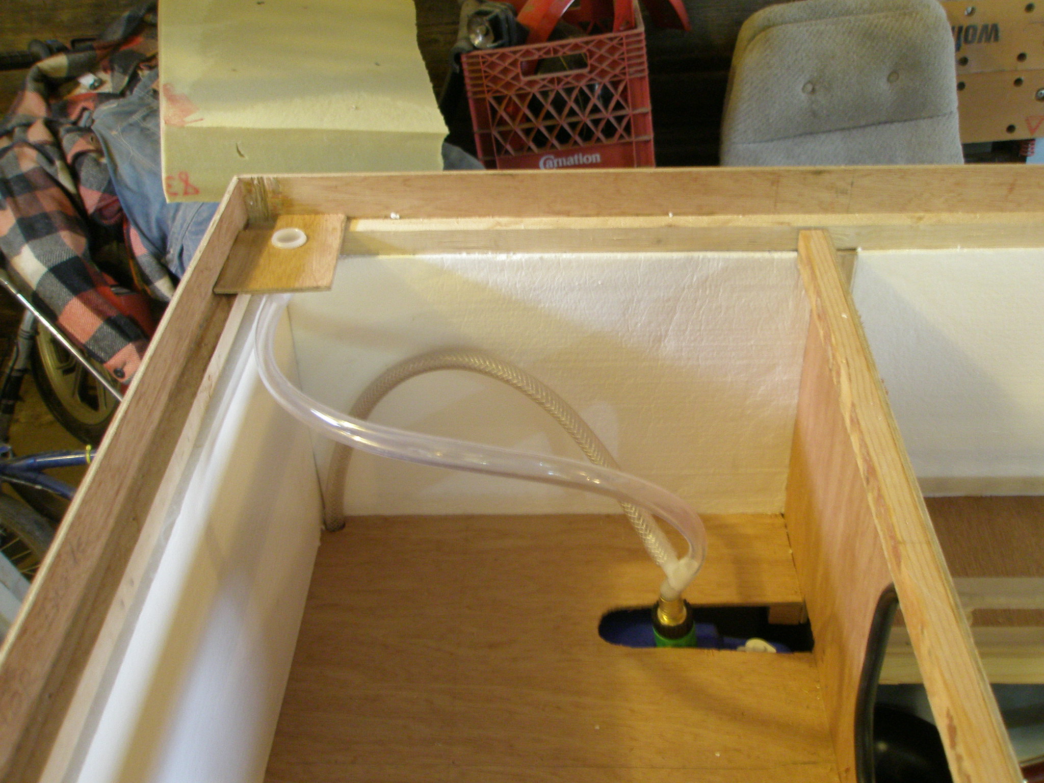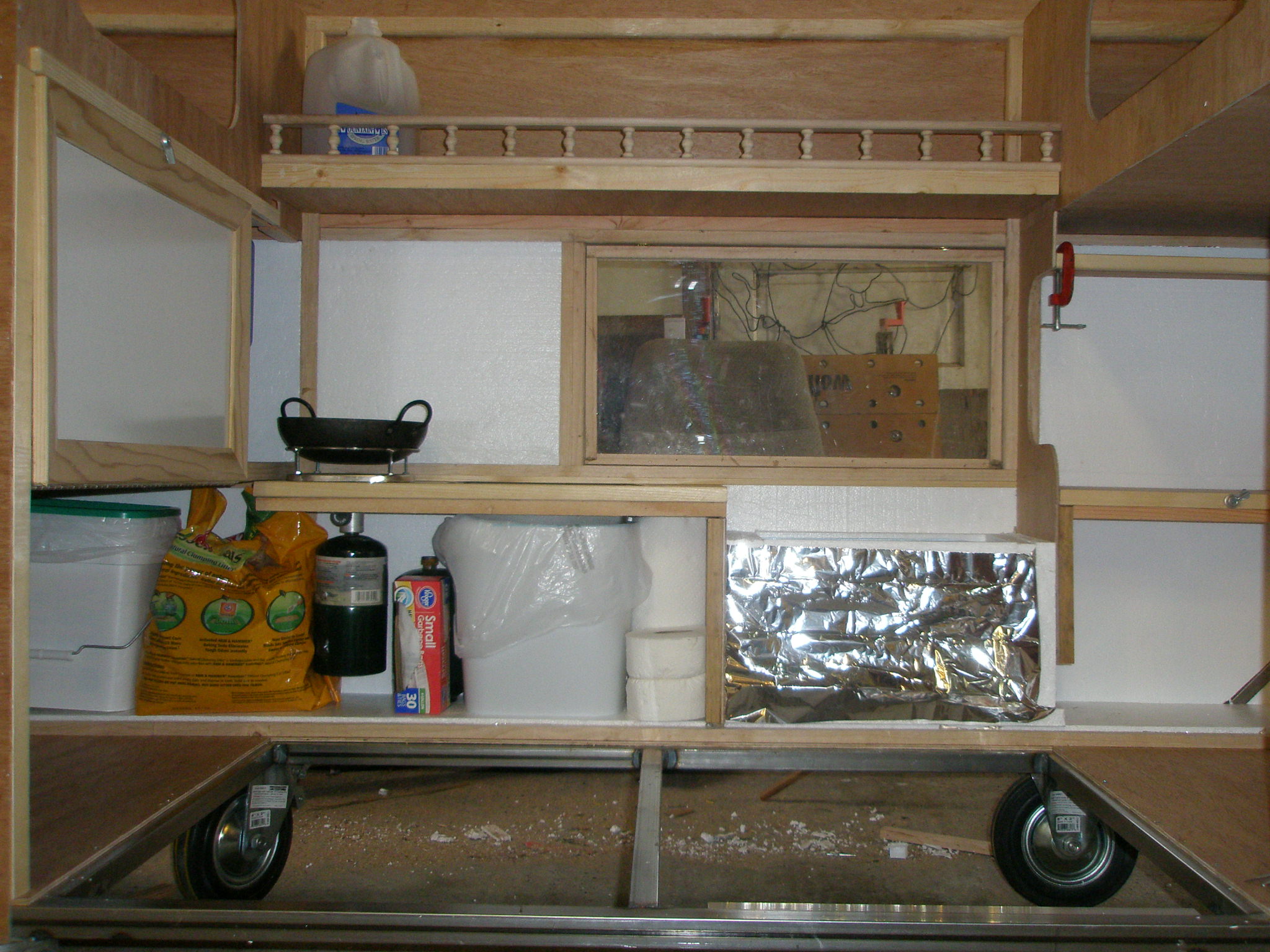 The food cooler was made with a 2-1/2 gallon water dispenser. I lined it with 2″ foam. The small compartment on the right was designed to hold a cup of ice,