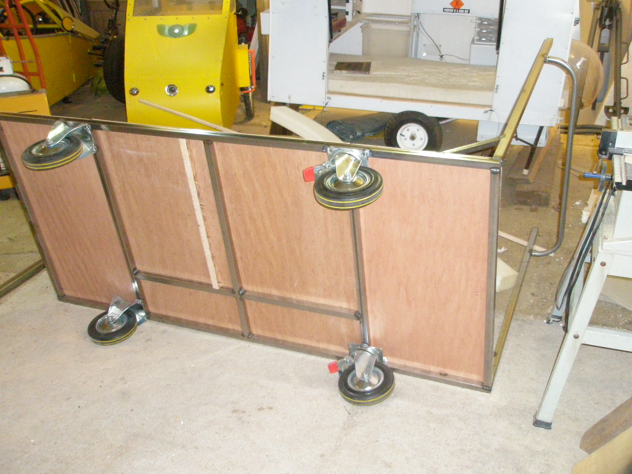 The base frame was made of 1″ box steel. The wheels were brought in for easier maneuverability.