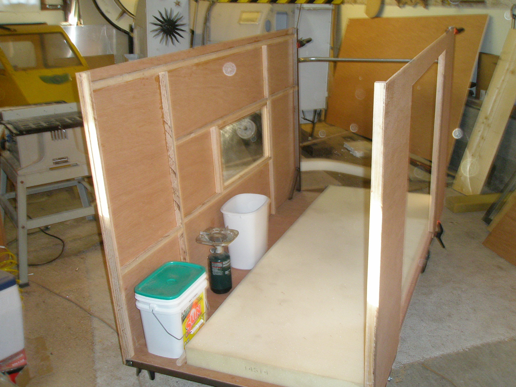 After many drawings I decided to build a mock-up of my idea using cheap paneling and an old door. The wheels came from Harbor Freight.