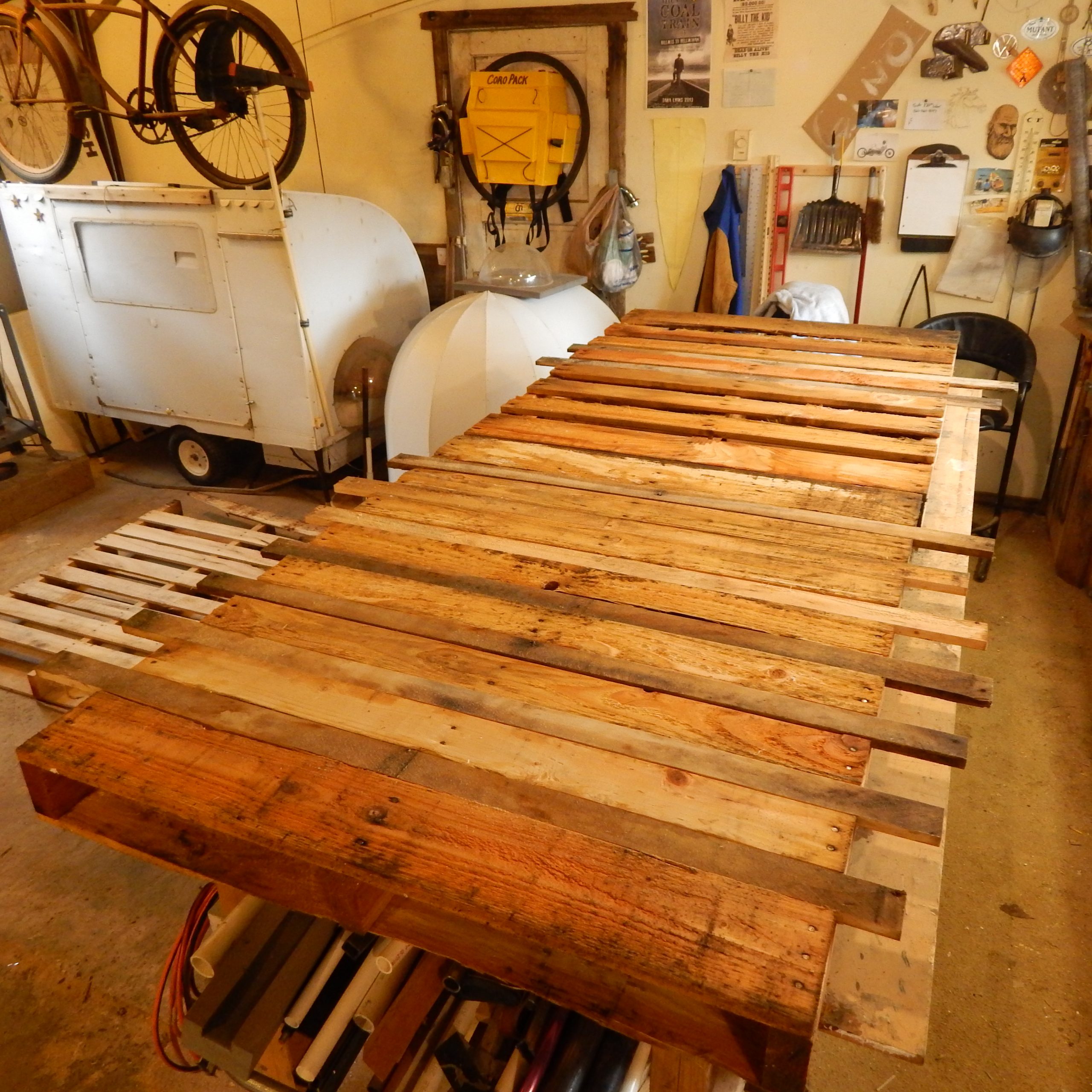 I started with two 40″ by 48″ pallets. I used the boards from a third pallet to fill in the cracks.