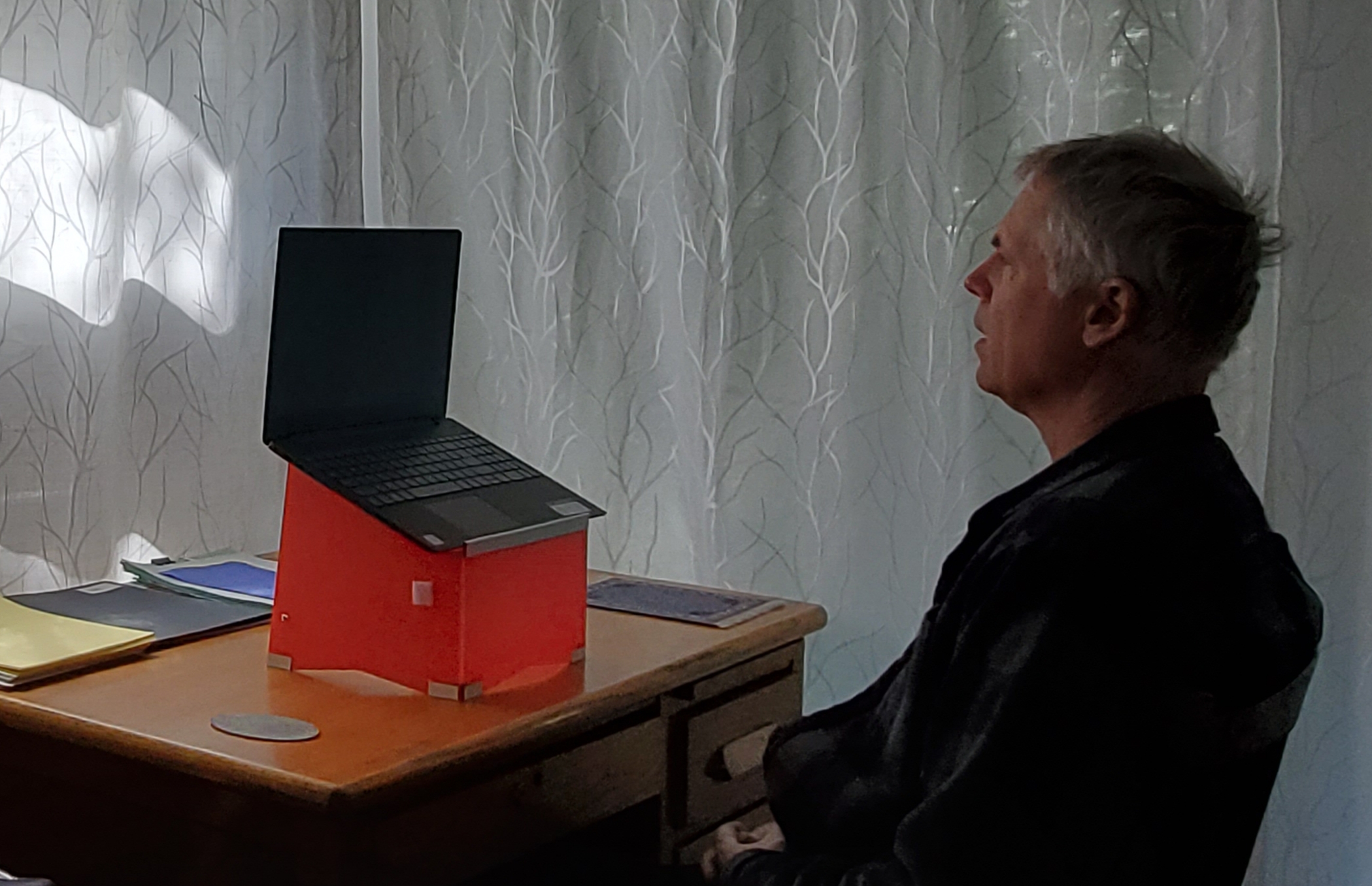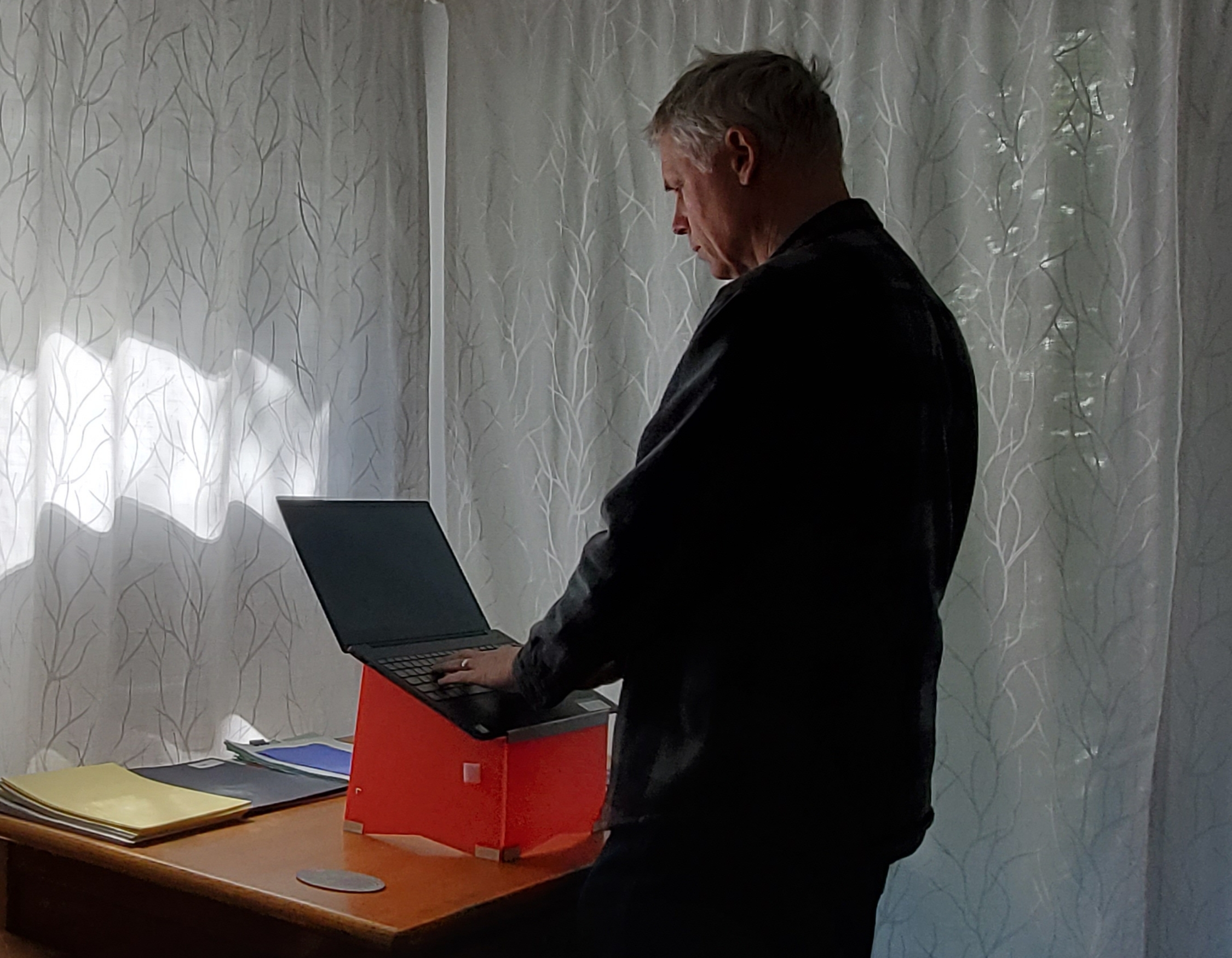 Her laptop is school issued. It’s unique in that the key pad detaches, allowing the teacher to walk around with the touch-screen monitor. The hard drive is in the this monitor making it very top heavy when joined with the keypad and opened. Fortunately the monitor hangs down a half inch on the bottom. This made it easy to make a notch in the plastic to keep the computer secure on the stand.