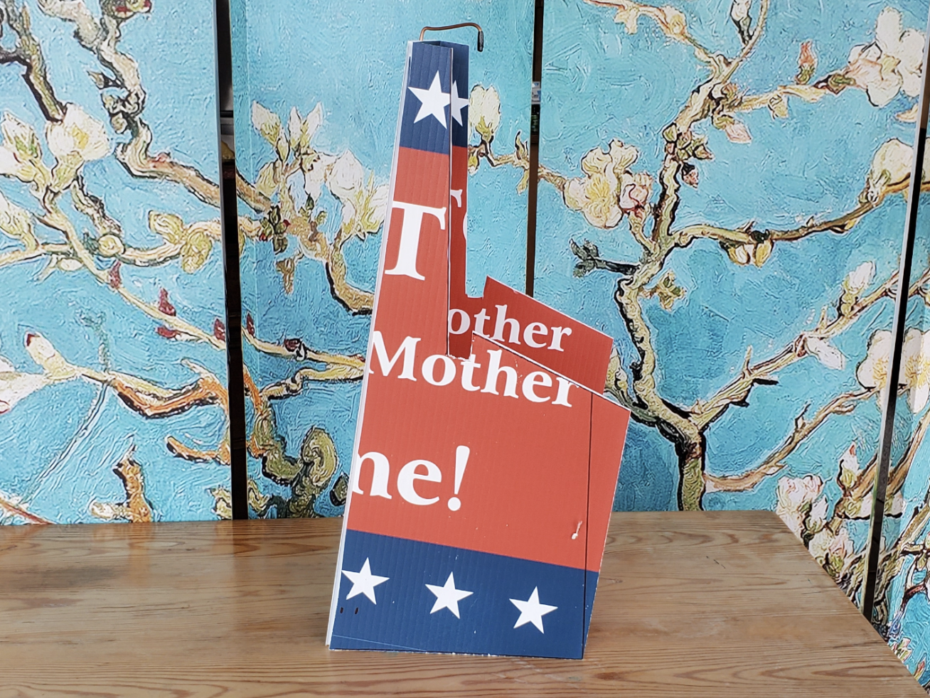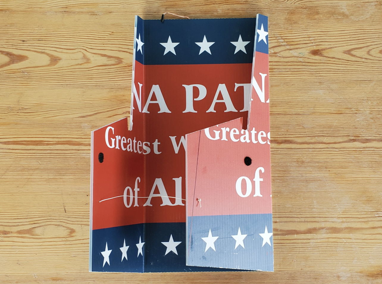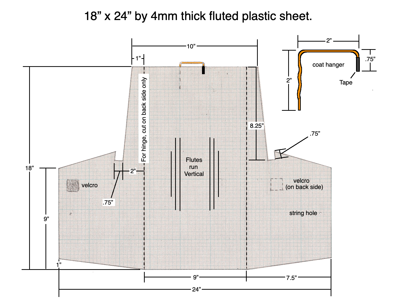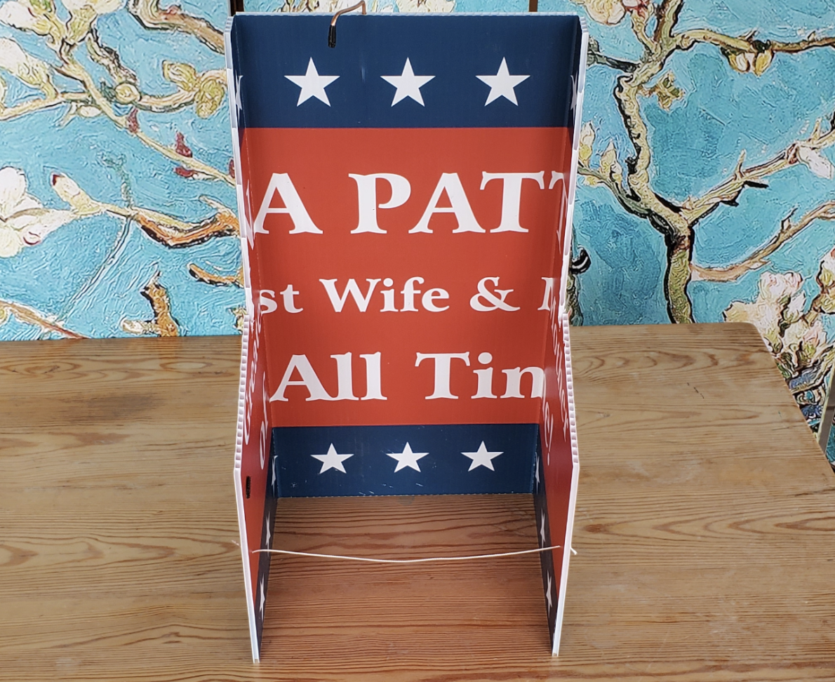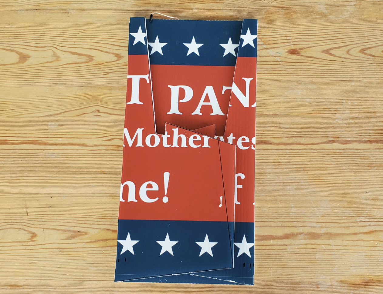 This stand measures 30″ in length which is longer than the width of a standard campaign sign. The hinge cut on fluted plastic is a superior way to make a hinge, lasting thousands of bends. If you don’t want to buy a whole 4×8 foot sheet you can use tape for the hinge, or better yet take a 4″ length of not-so-straight coat hanger and bend it in two. Insert them on the end flutes on the top and bottom of each joining section. If you do this, make sure the flutes run vertical on the stand when erected.