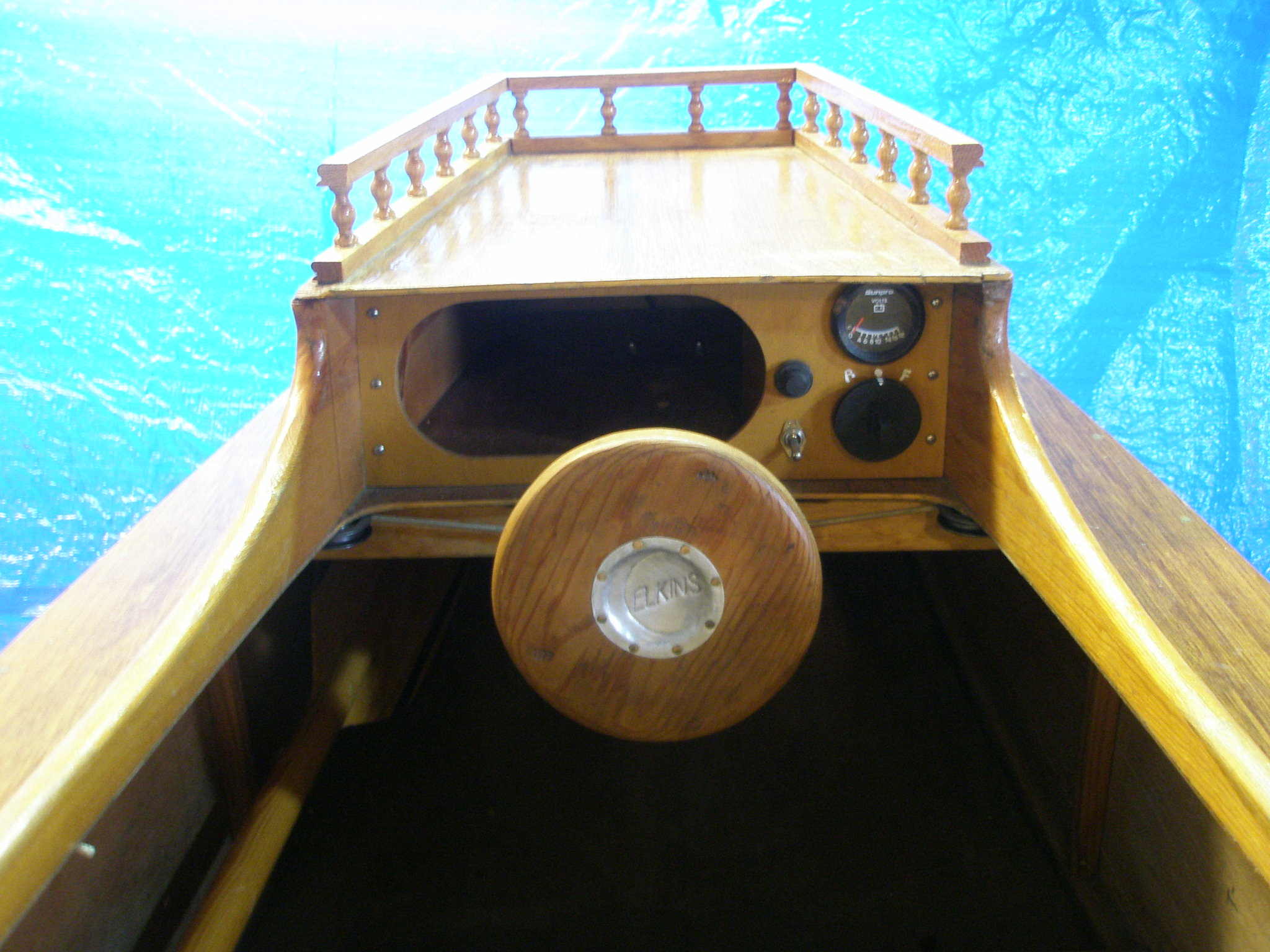 A steering wheel was added with lines going back the the motor. A glove box was also added. On the right I have the speed controller, volt meter, light switch and horn button.