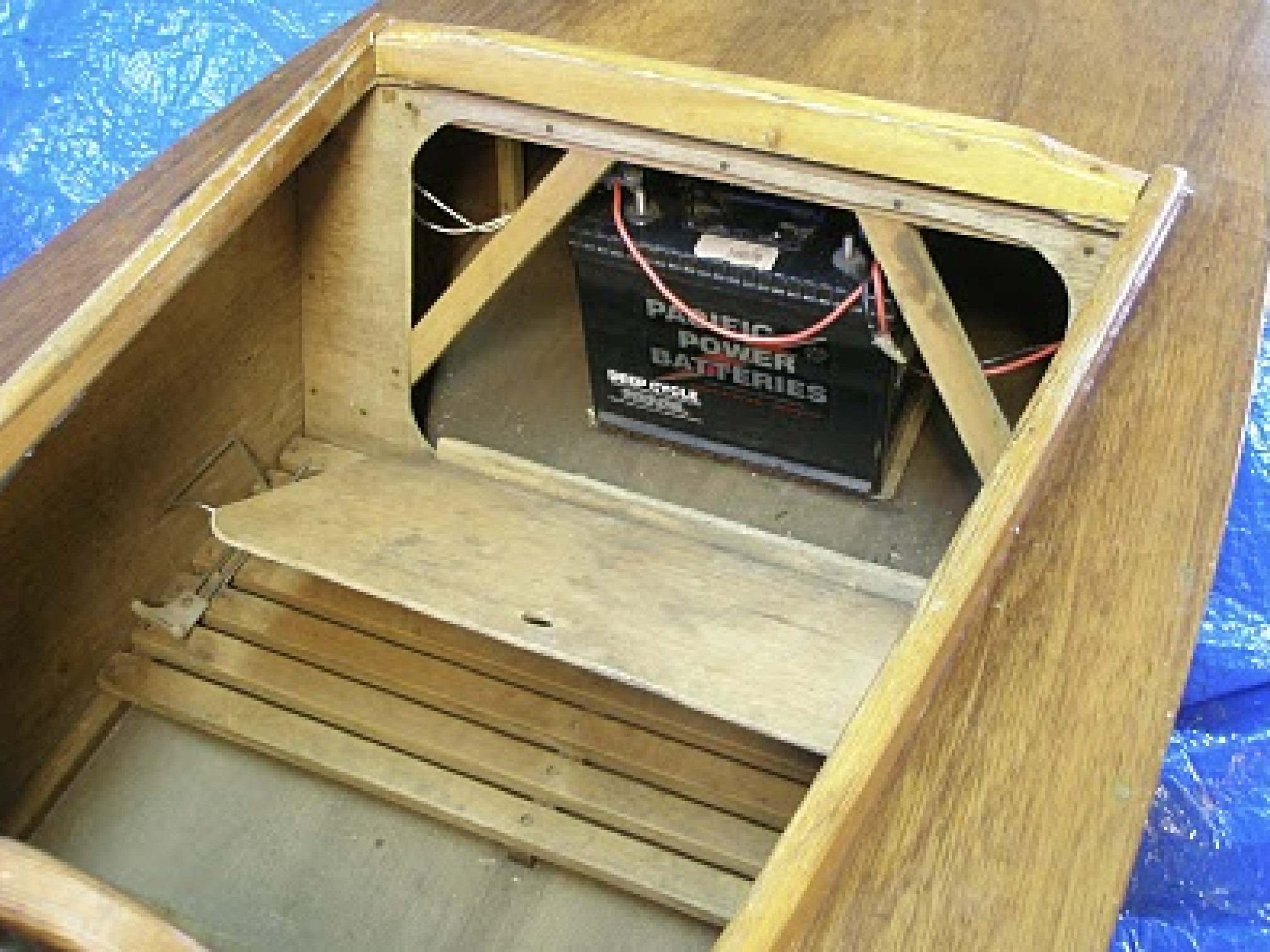 The deep cycle battery is stored behind the pilot. On a fresh battery with full charge you can go for about 31/2 hours. Top speed is a fast walking pace.