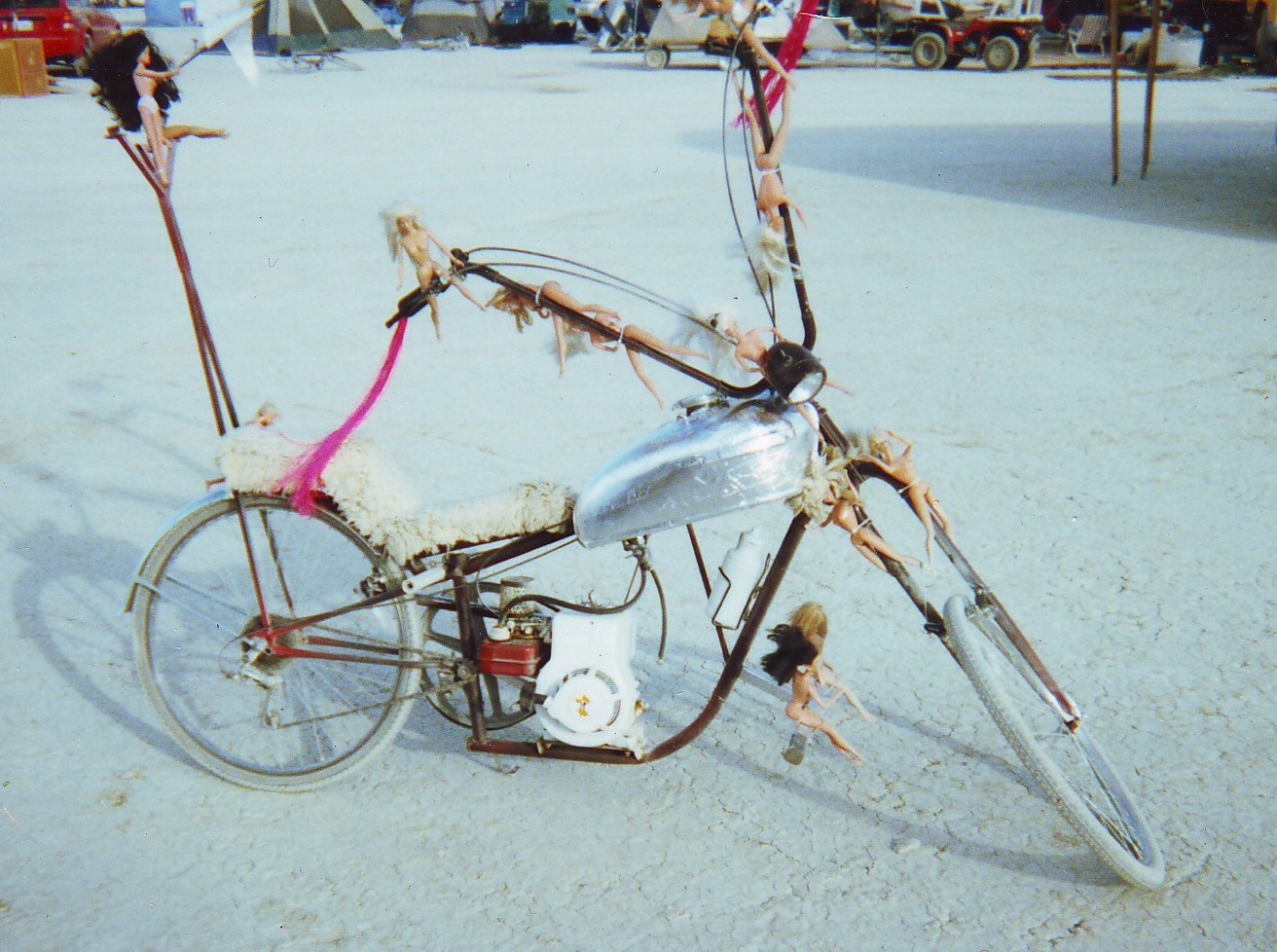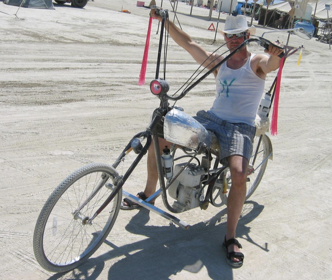 I made this motorized bike for my Third Burningman adventure. I called it the Hardley Davidson. That’s Hardley with a ‘D’. Get it?