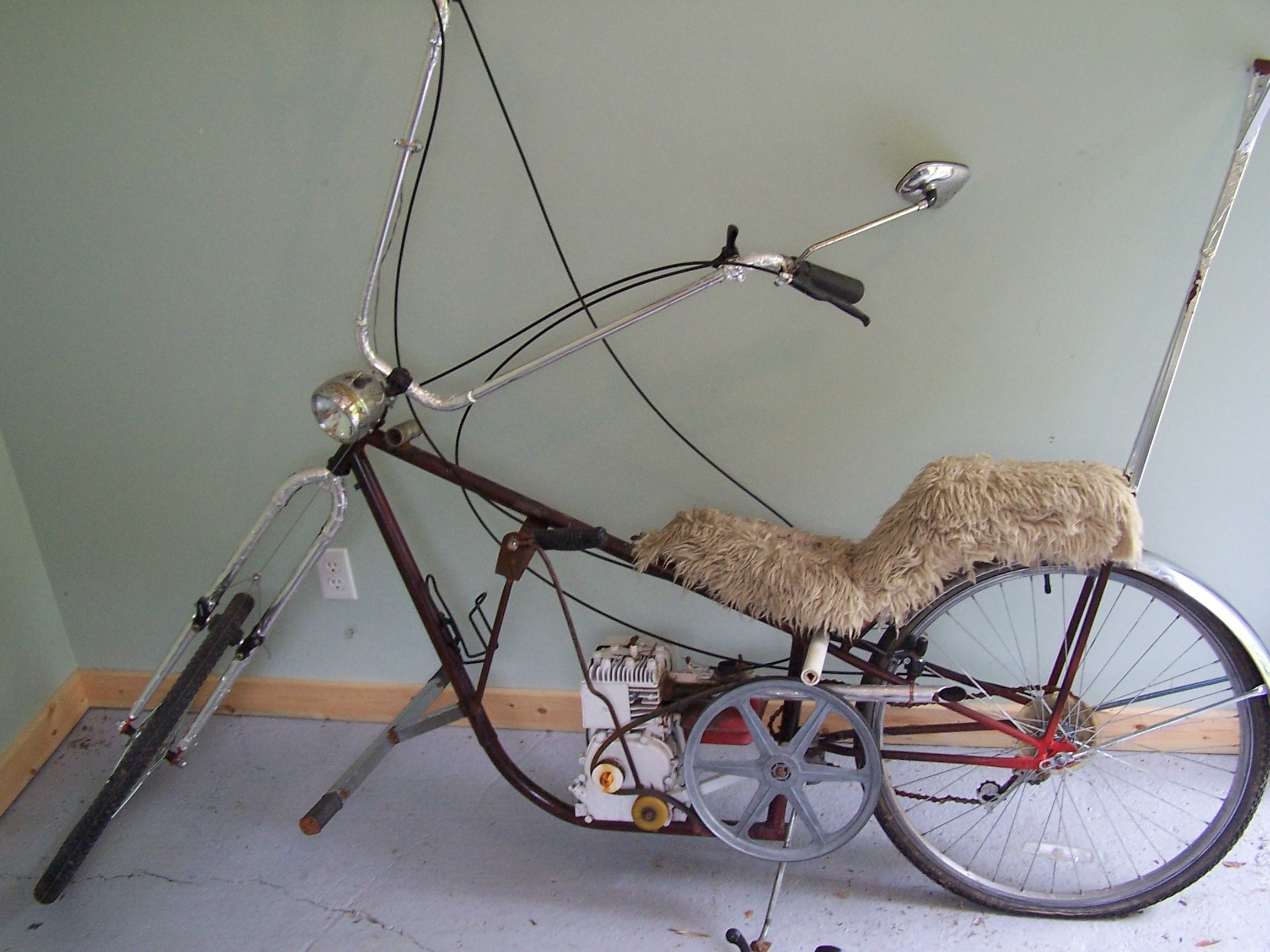 I added a cushioned seat back and bent up a length of EMT electrical conduit for the handle bars.