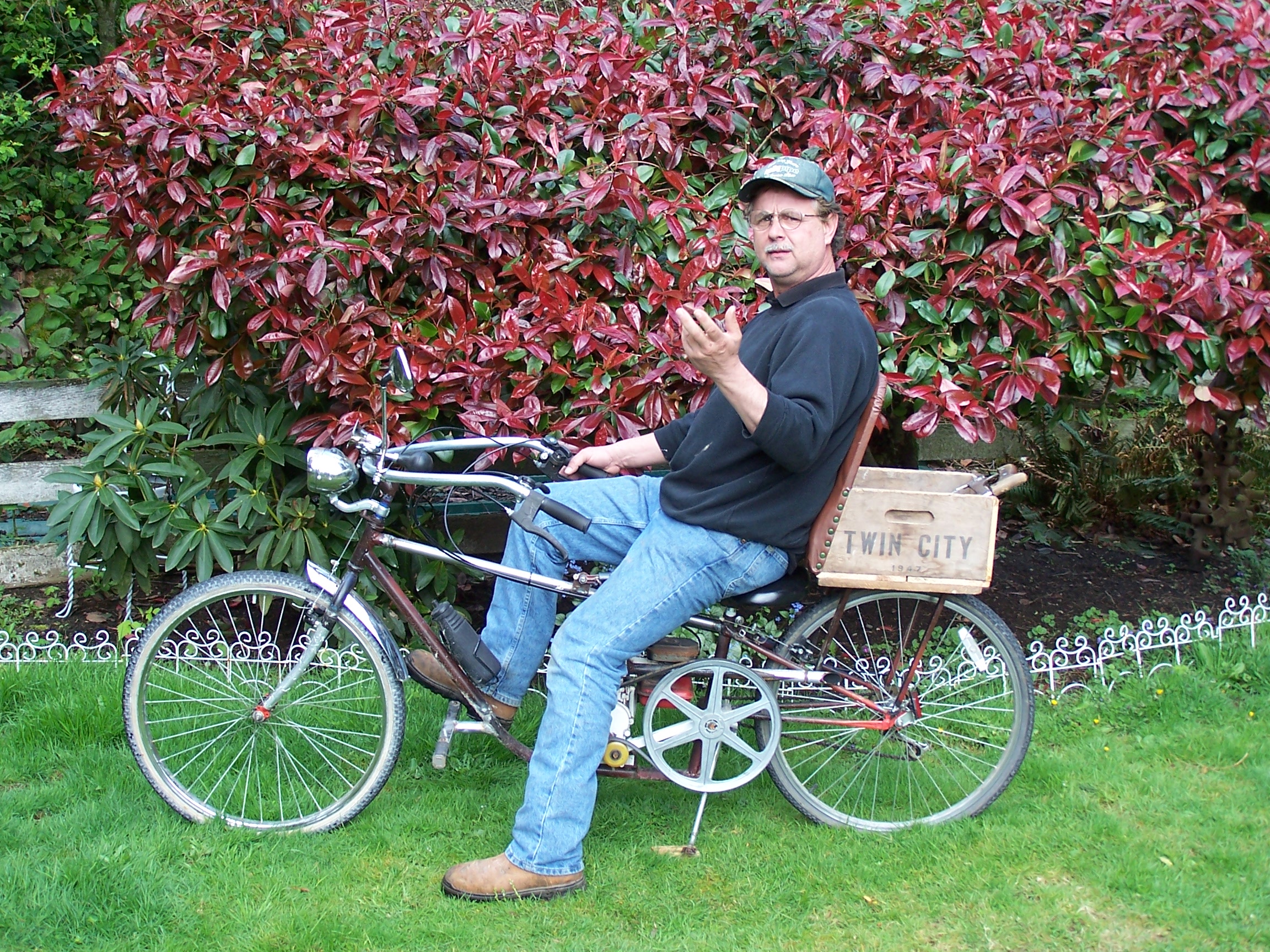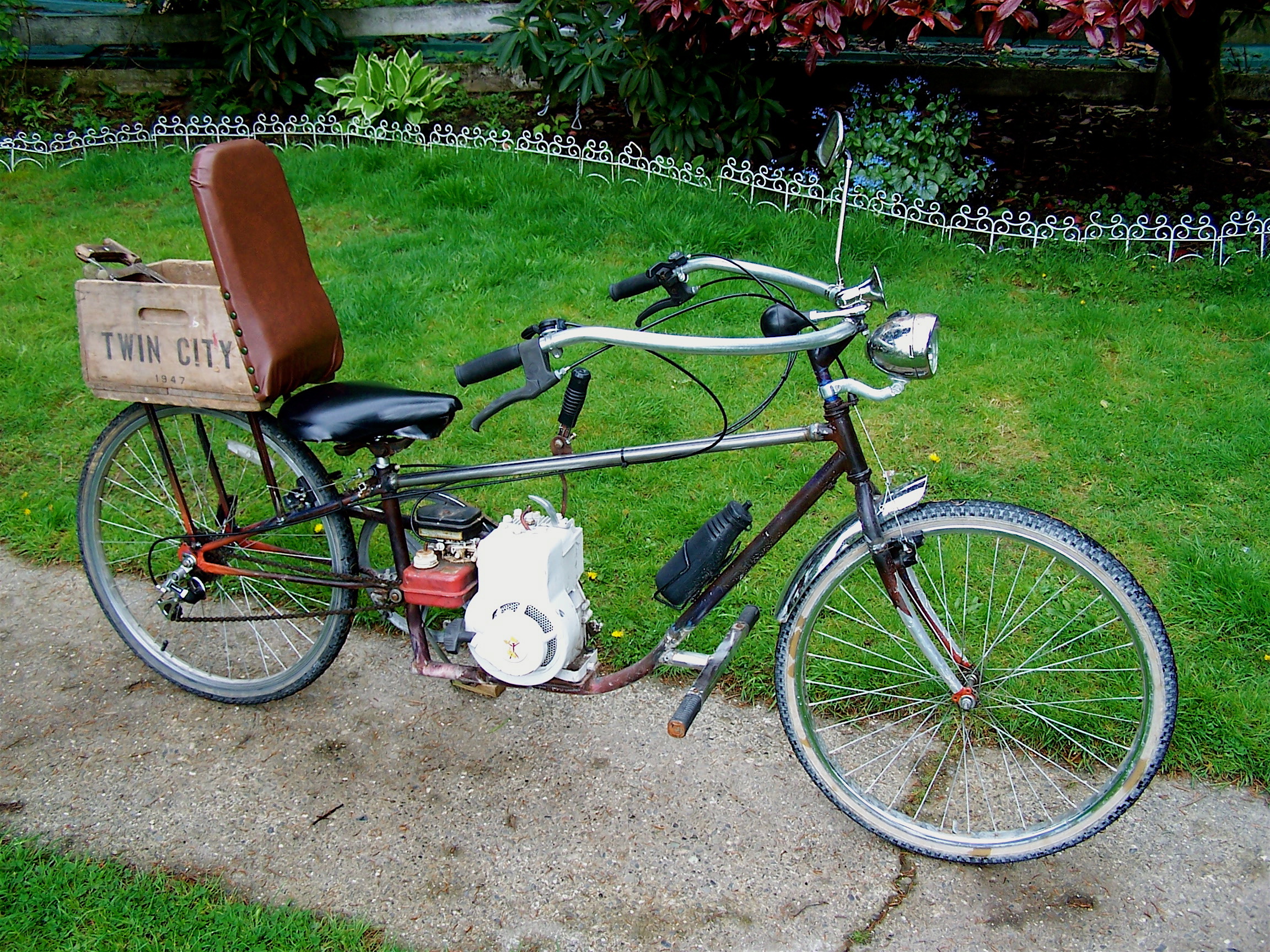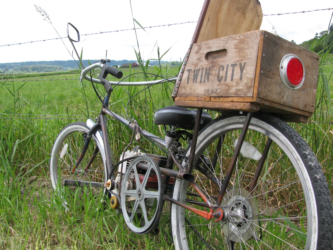 When I moved into my home I found this 1947 ‘Twin City’ wood box in my shop. It came from the local frozen pea factory. Had to have it on the bike.