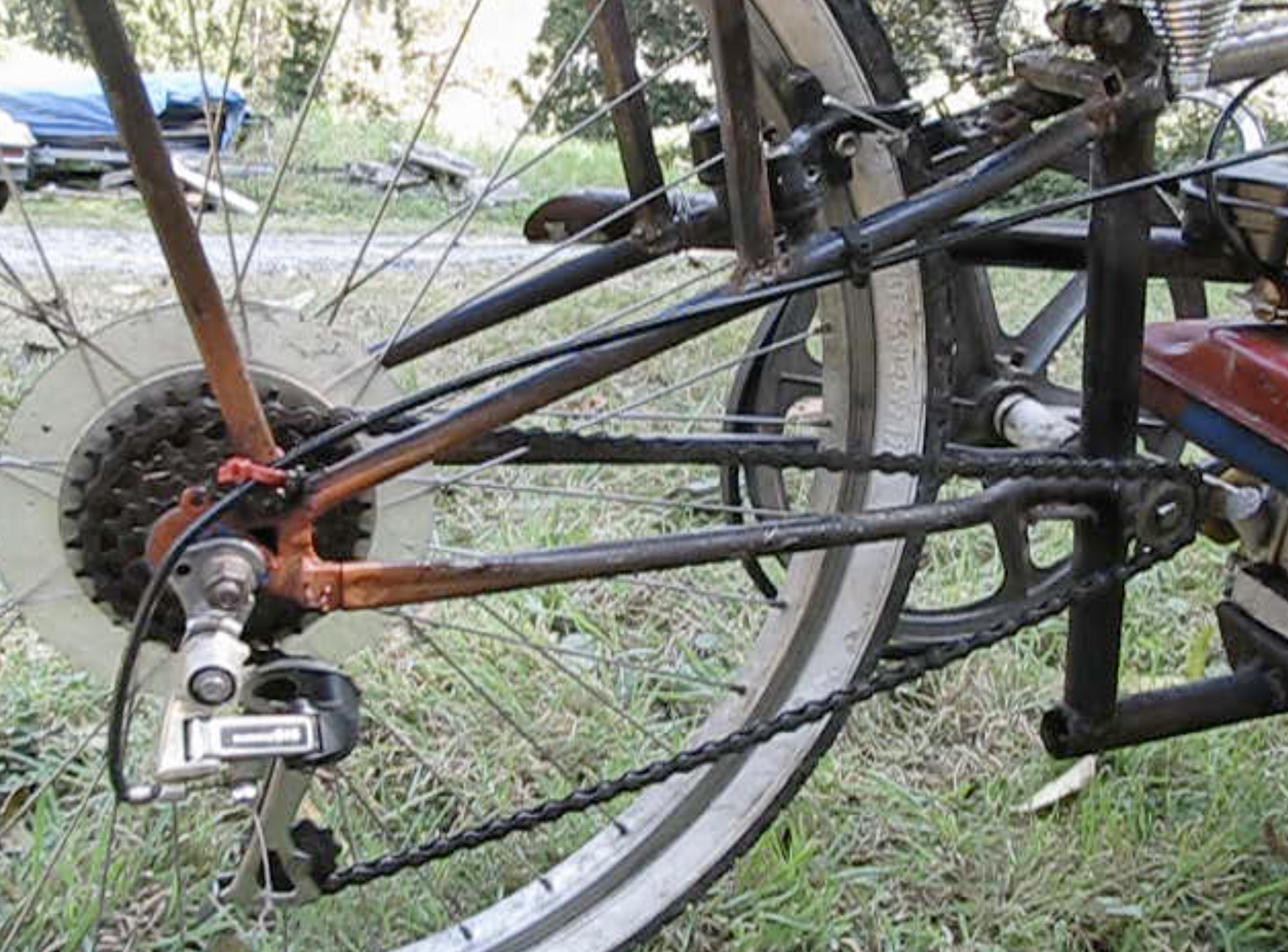 Notice I borrowed the same drive-train design as my first Burningman trike below. The 13 tooth 1/2″ shaft sprocket is salvaged from the rare chain-drive self-propelled lawn mower.