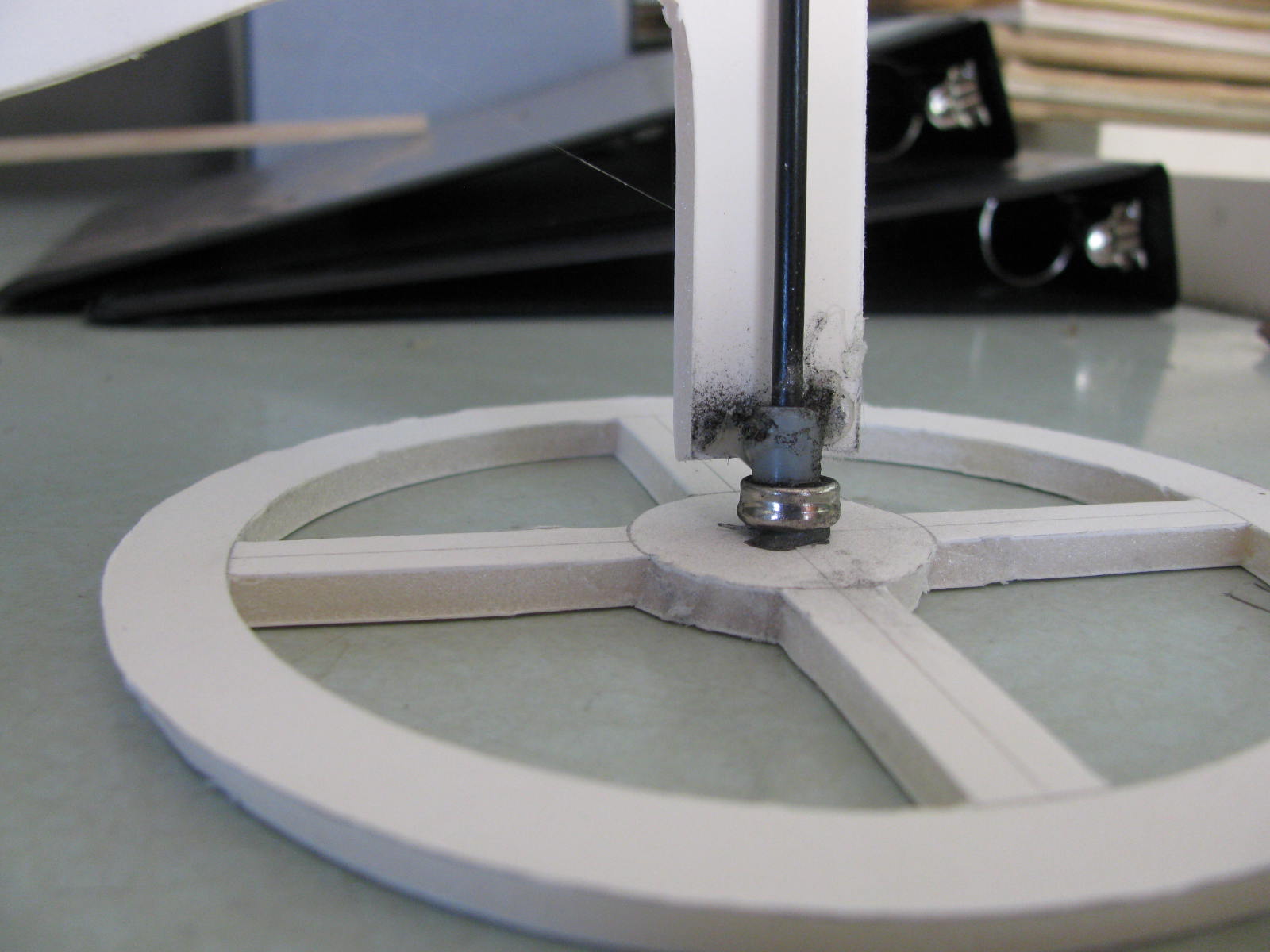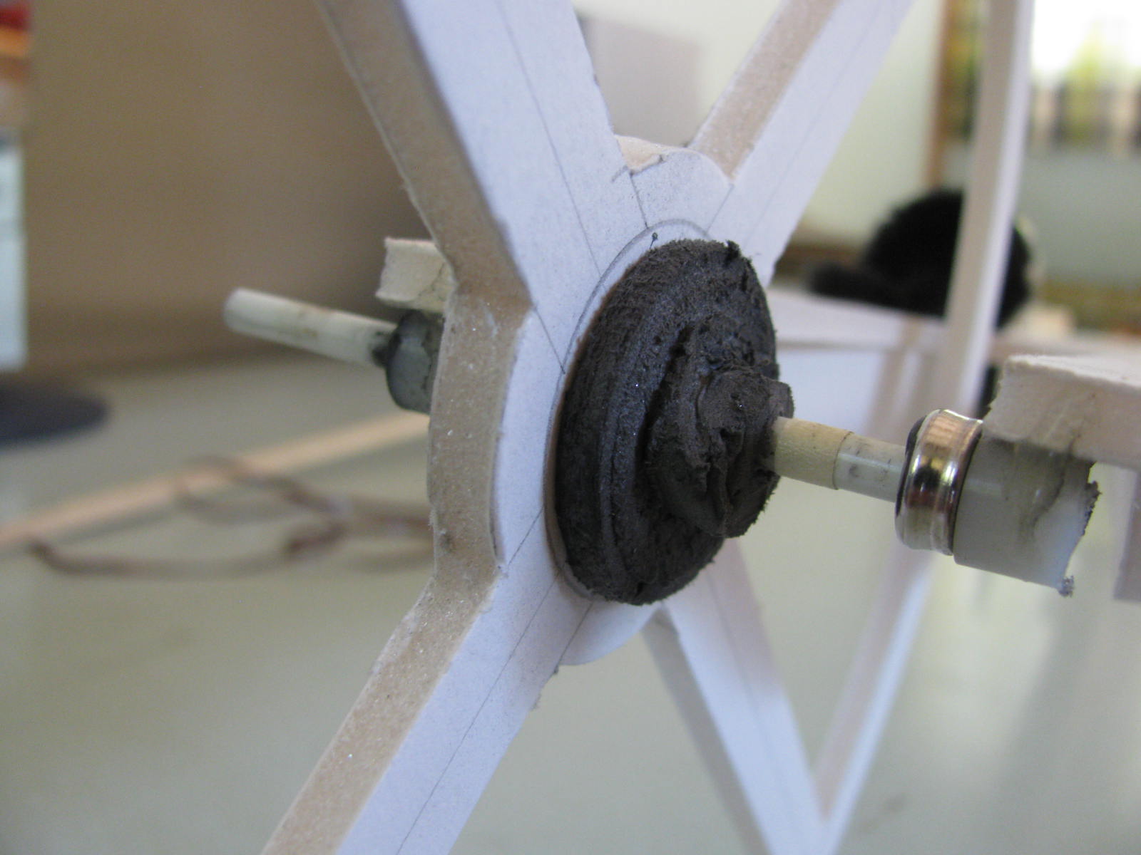 The glued on drive arm is a length of balsa wood. The drive line came from a cassette tape.