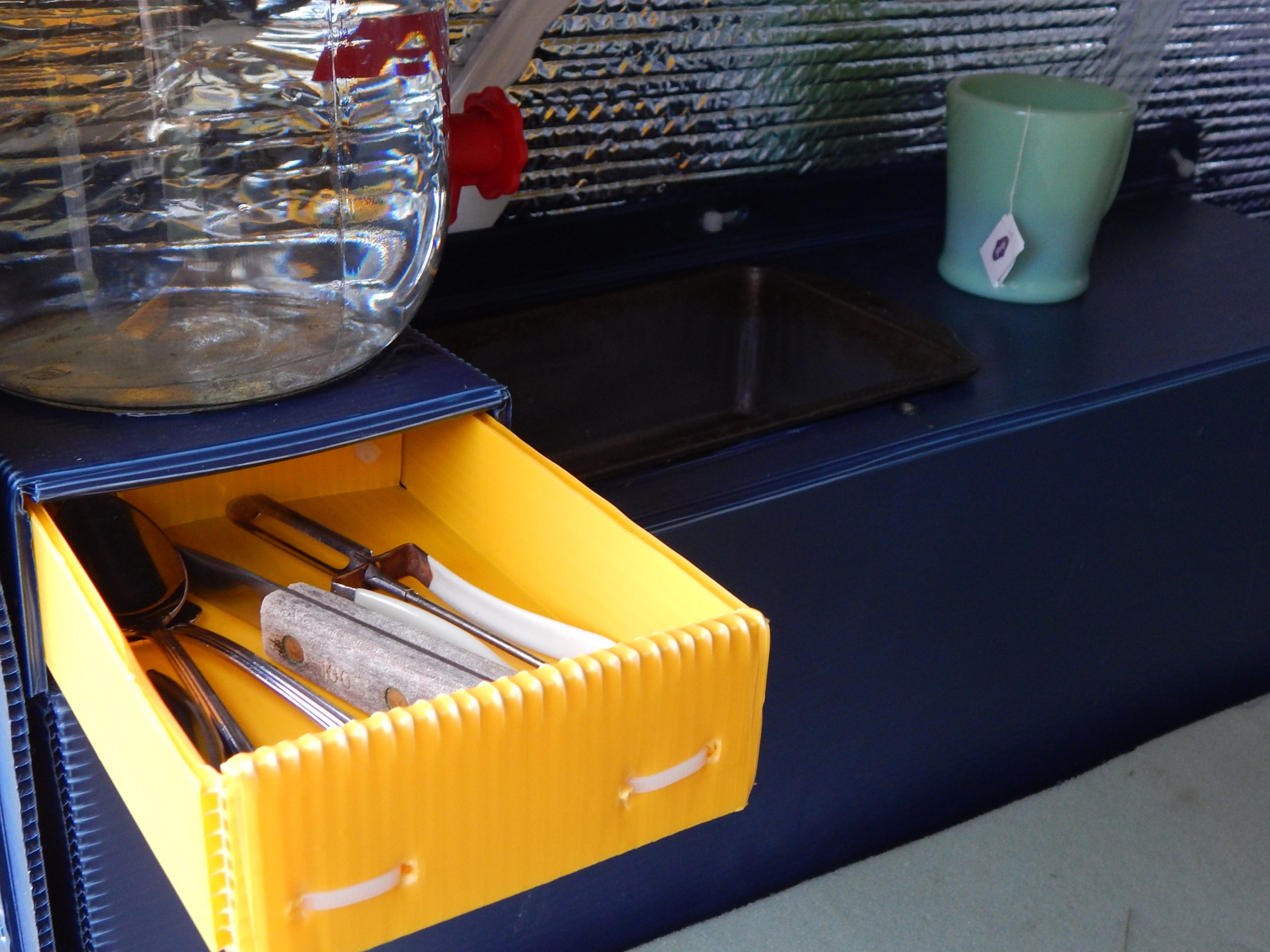 A one gallon glass water jug resides above the utensil drawer. The Baking pan sink is removed to reveal the trash can.