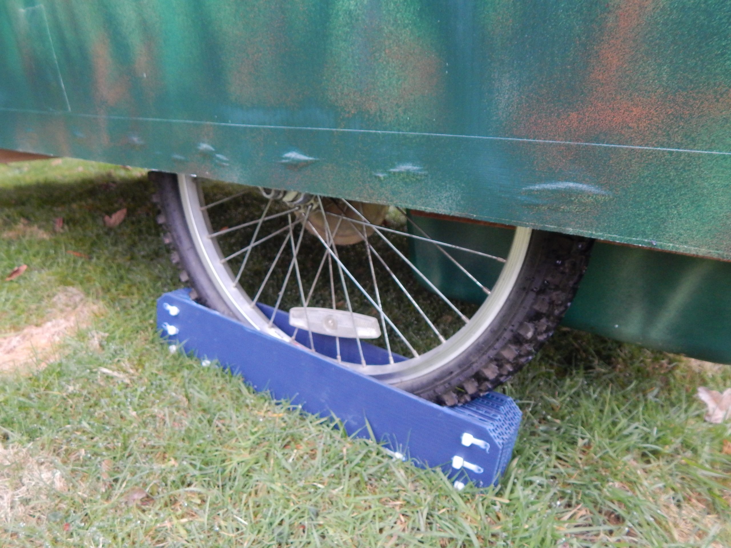 Wheel chucks are made using scrap material and zip ties.