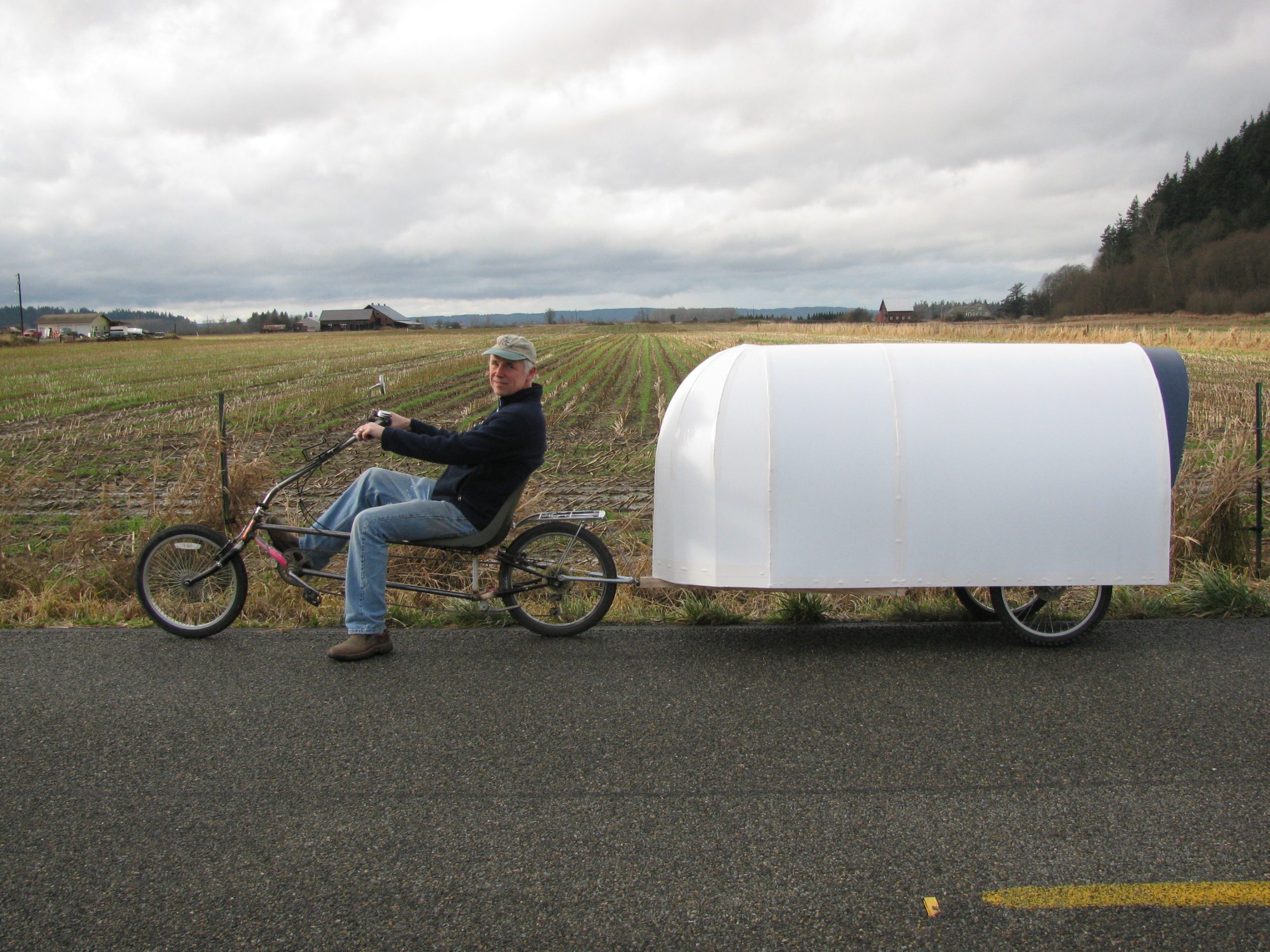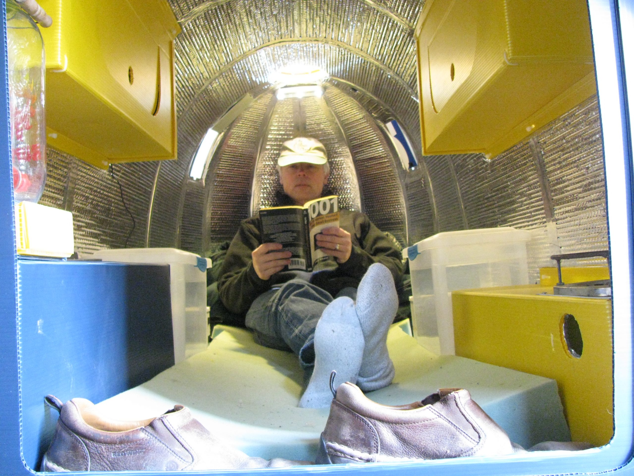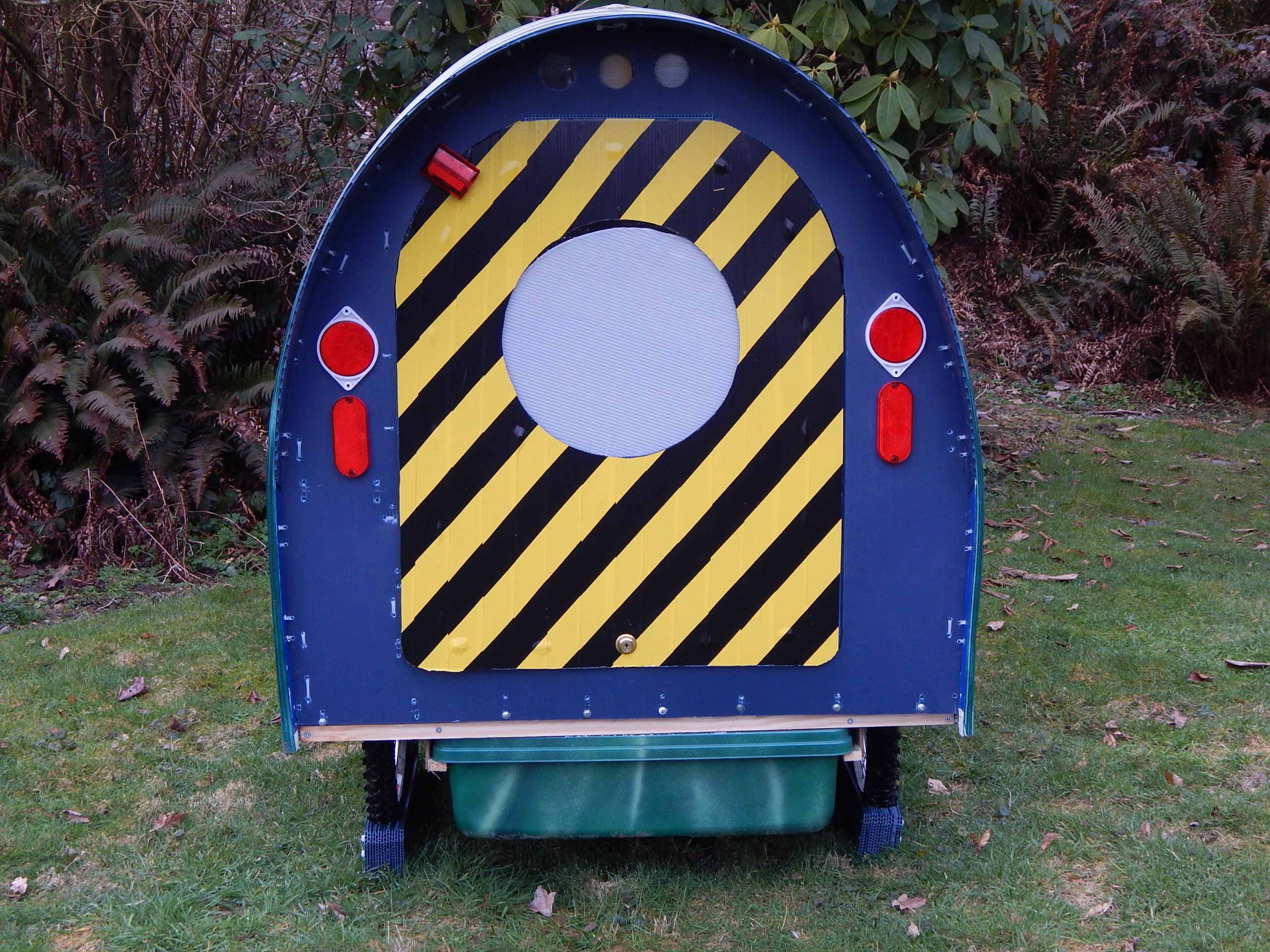 The front of the camper was rounded for better aerodynamics. Most of the fluted plastic used came from recycled campaign signs.