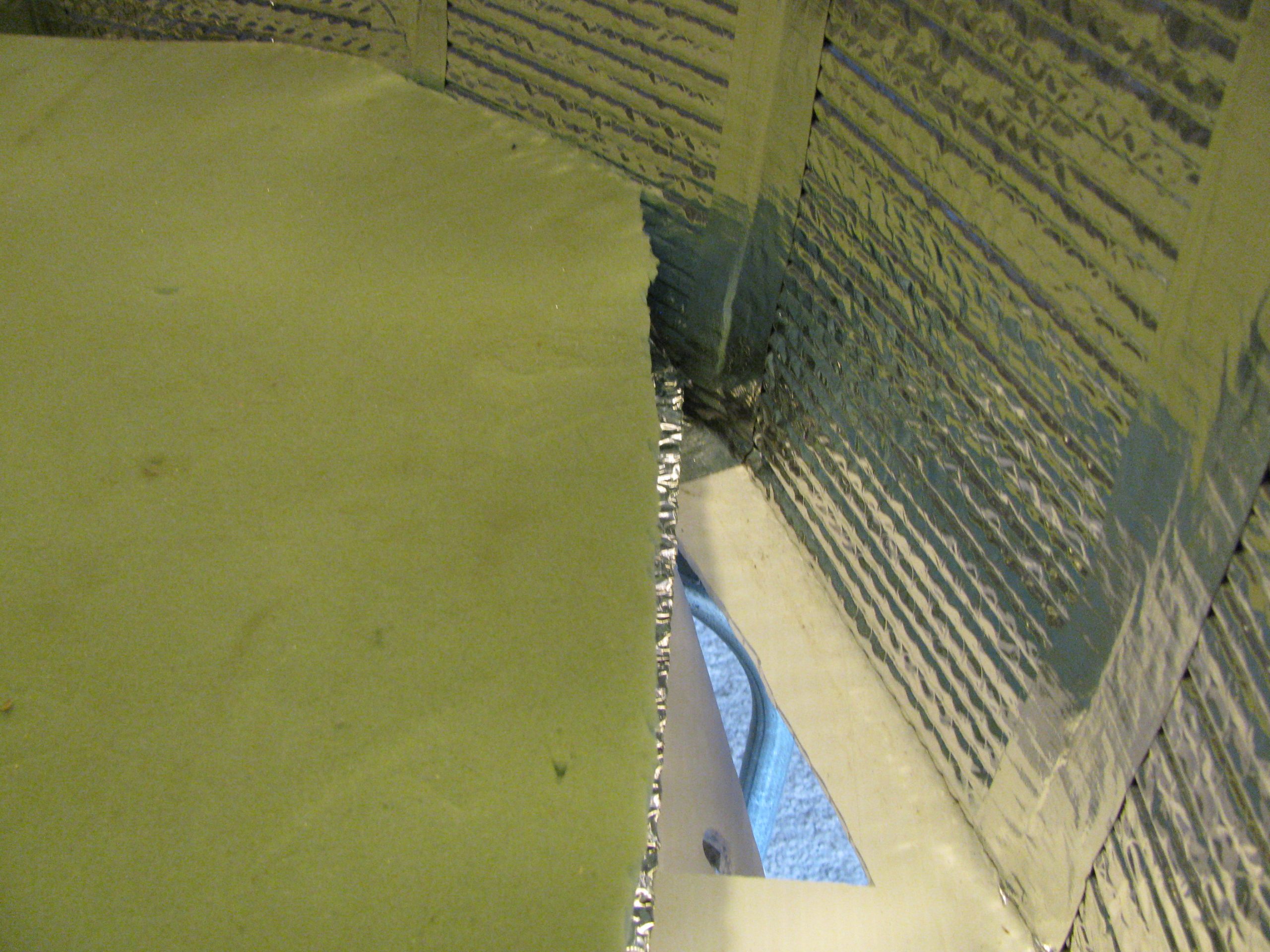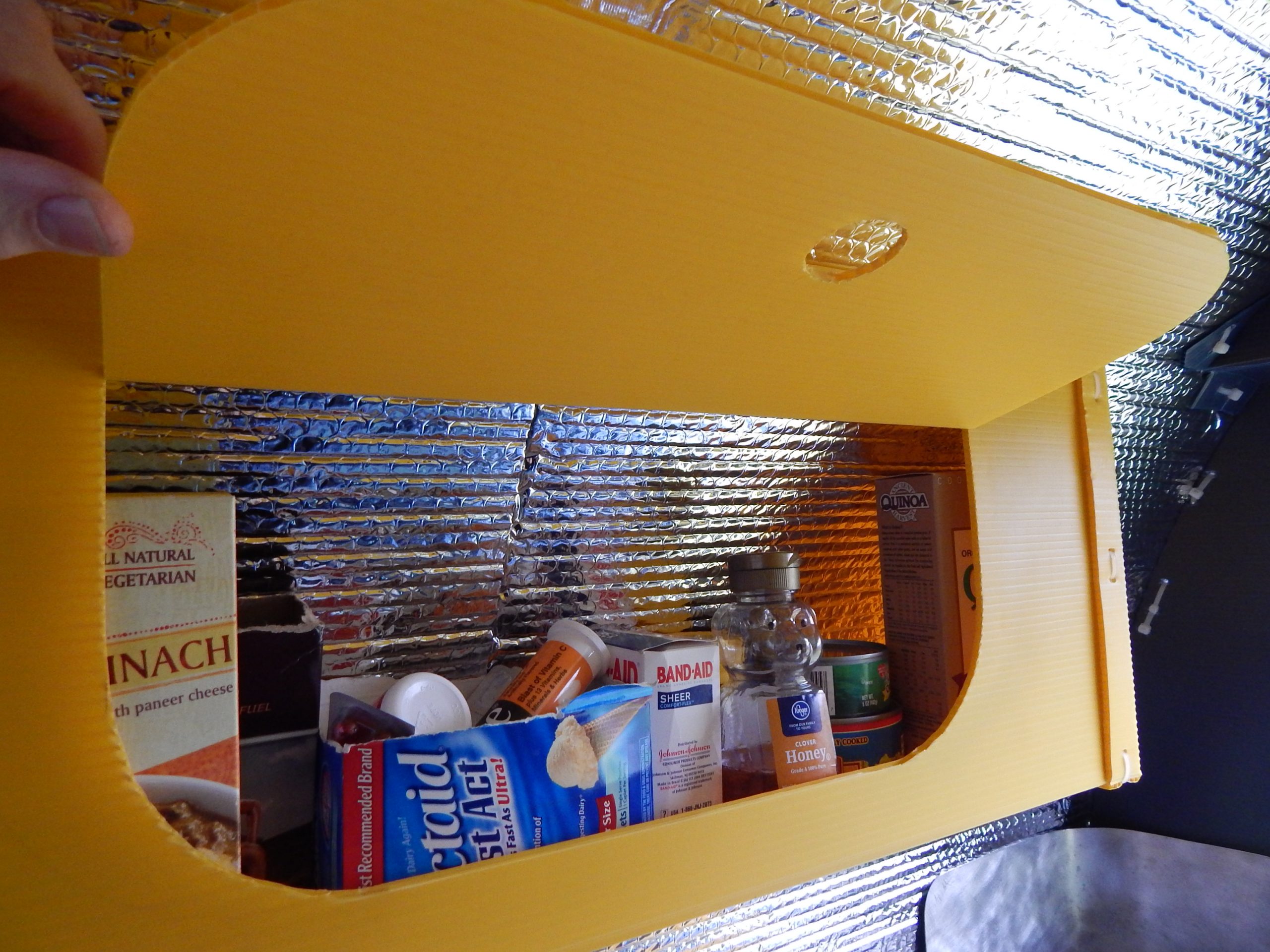 These simple fluted plastic storage cabinet doors lock in place when pushed in. They hold light weight goodies and help keep the foil backed bubble insulation in place.