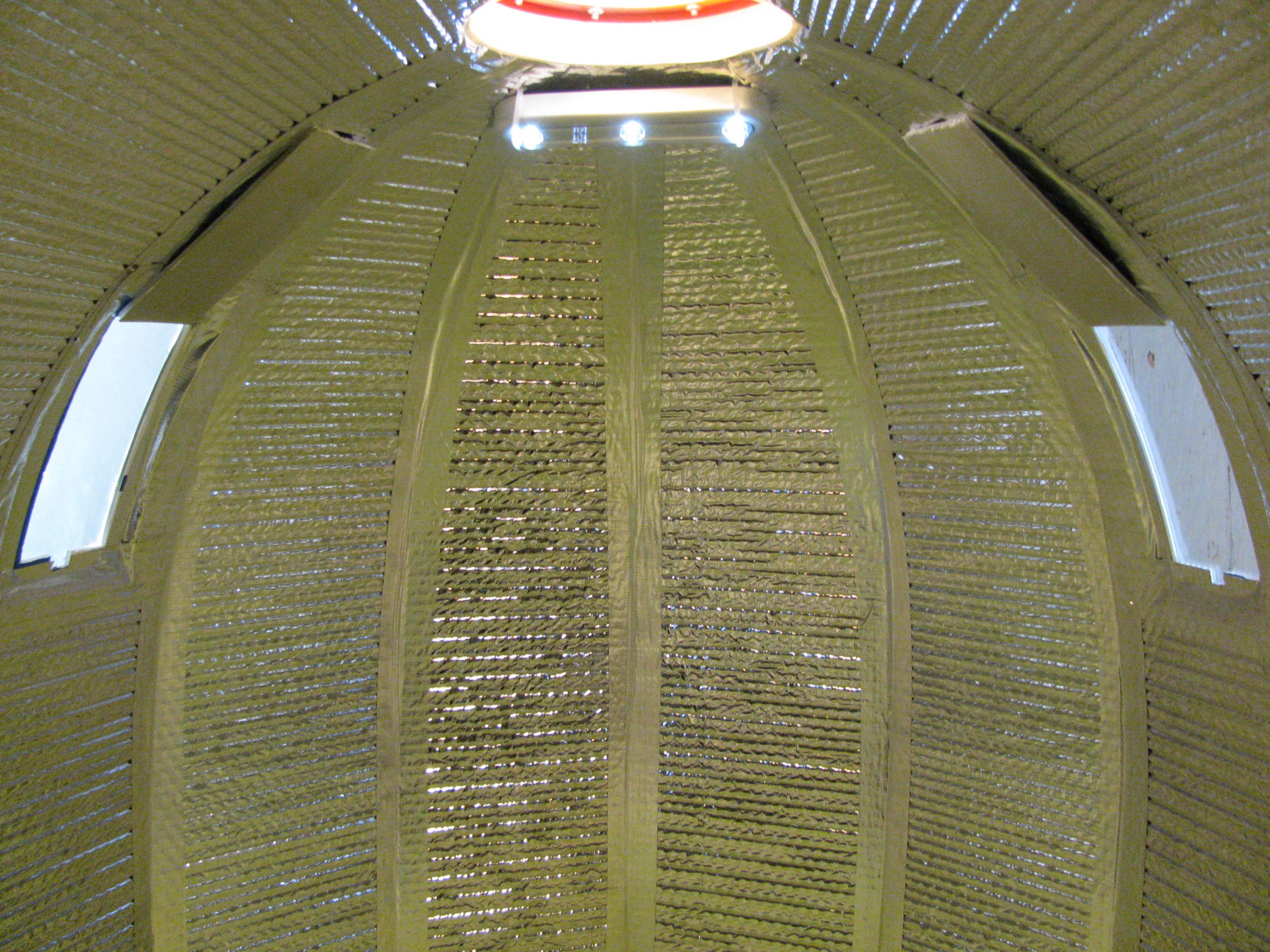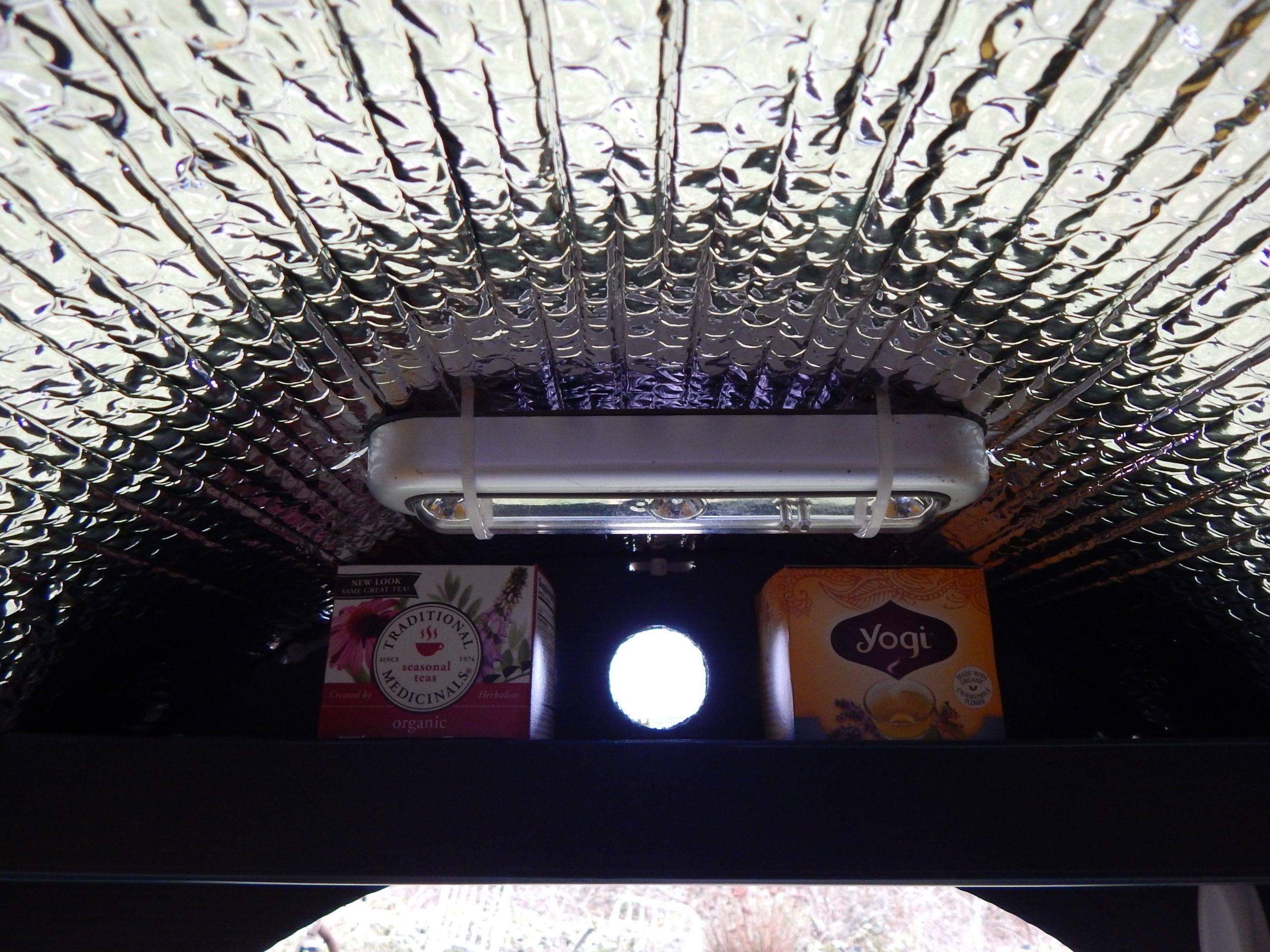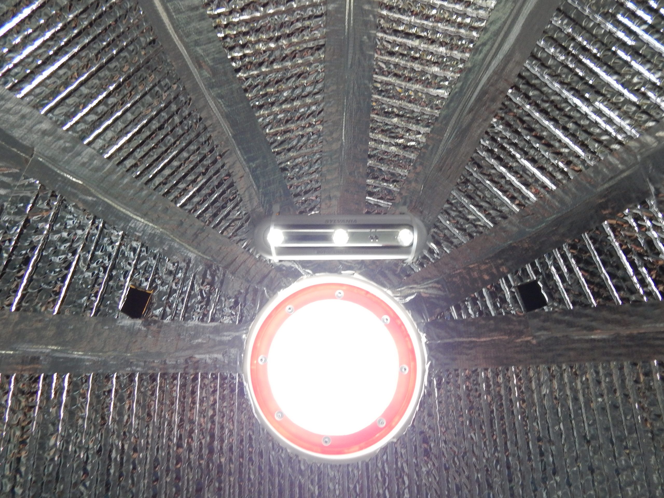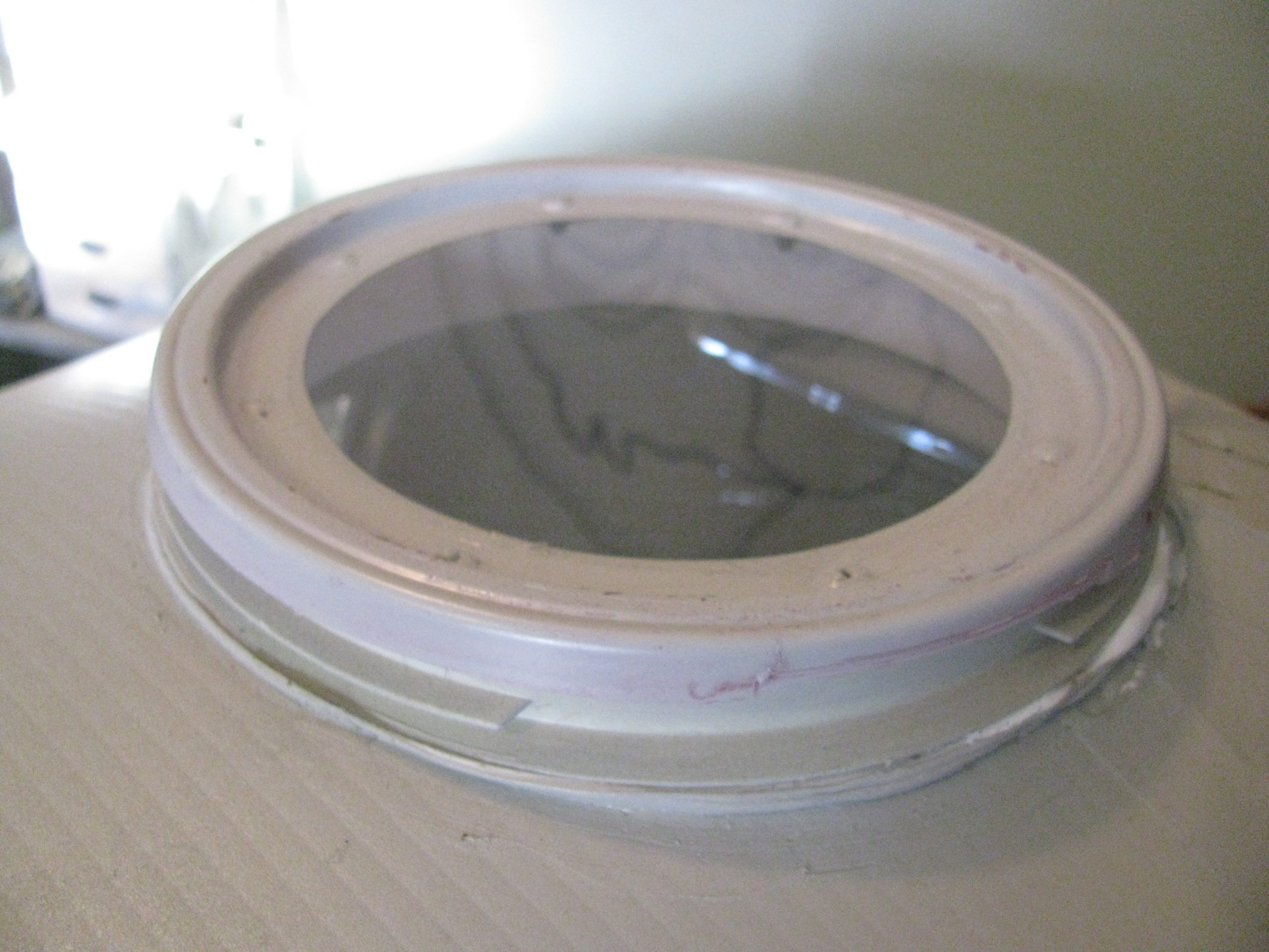 A one gallon bucket was used for the skylight. The center material was mostly cut out and a piece of plexiglass was pop riveted in place. It snaps shut and can be easily removed.