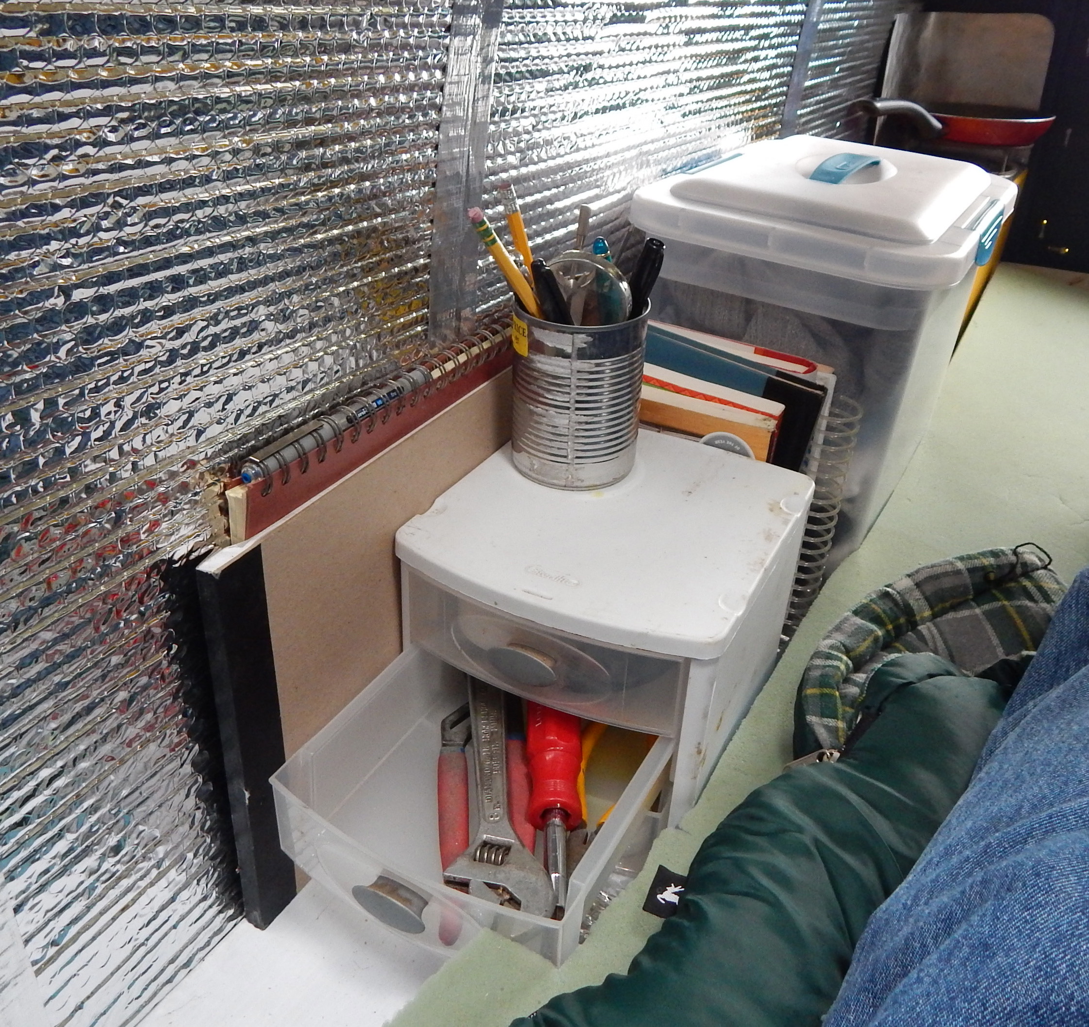 On the left we have storage drawers, books and supplies. When traveling the two clear cloth bins can be moved in between the wheel wells for better weight distribution.