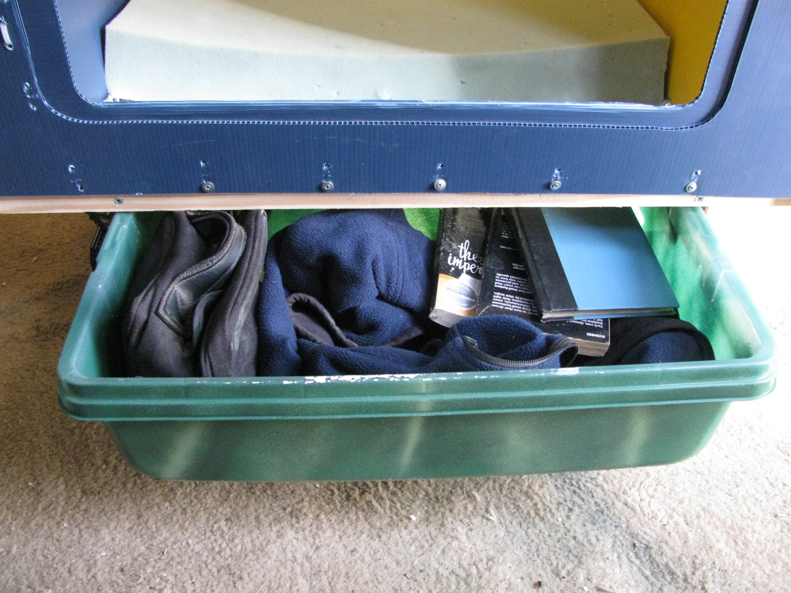 Seeing I had extra room underneath, an exterior bin was added. Heavier items are stored here to keep the center of gravity low when traveling in case of high winds.