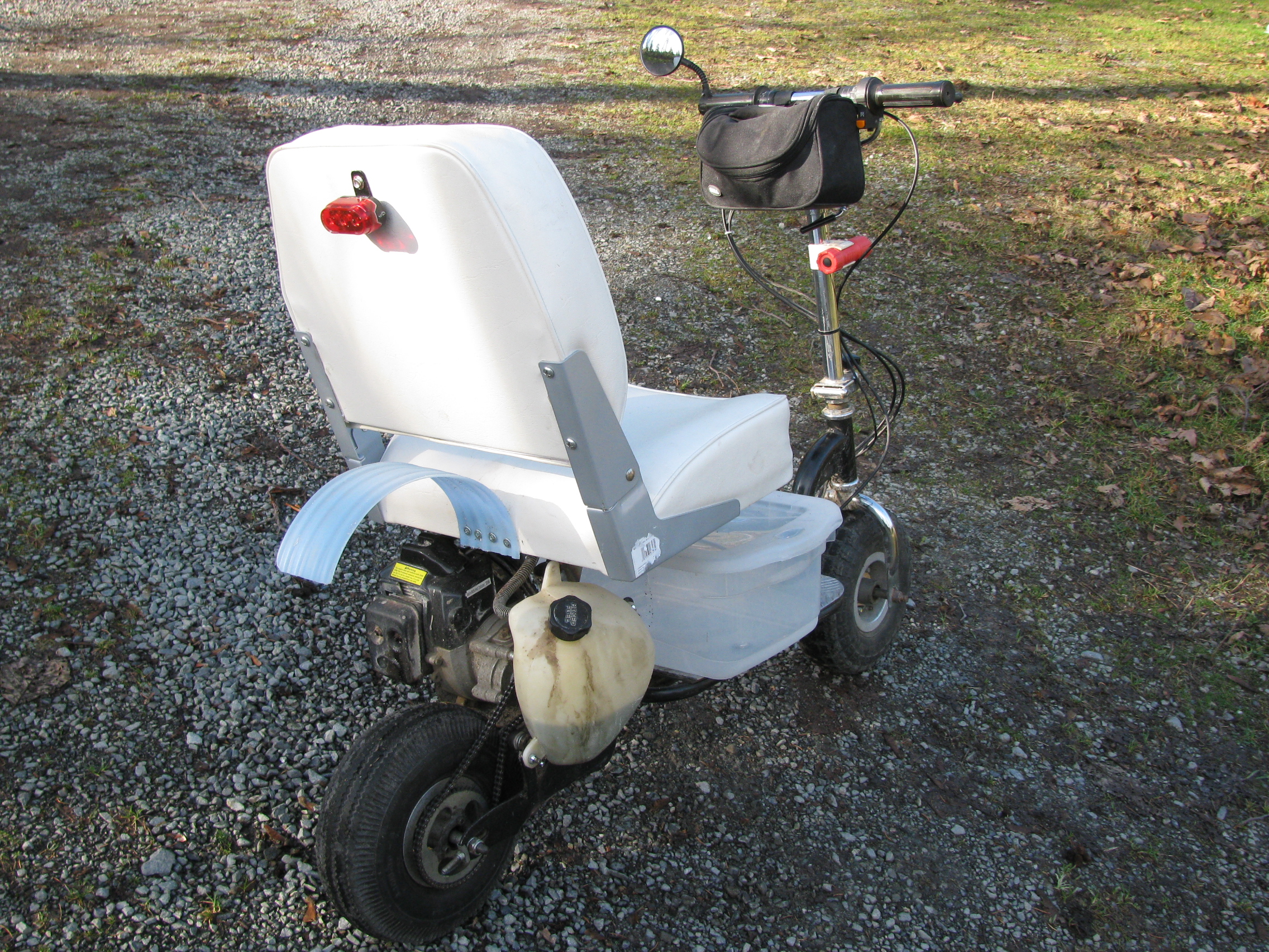 This was the third of my stand-up scooter recumbent conversions. This Zooma was built a bit cheaper than the Goped. The Goped had single forks for easy