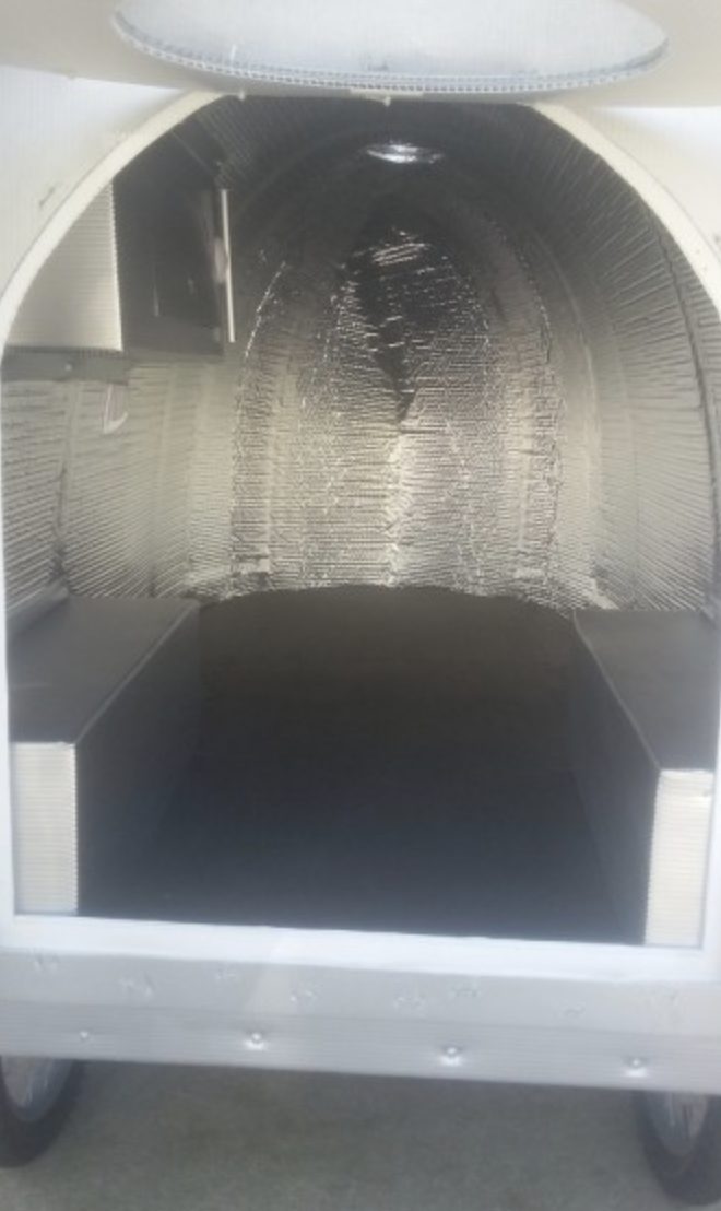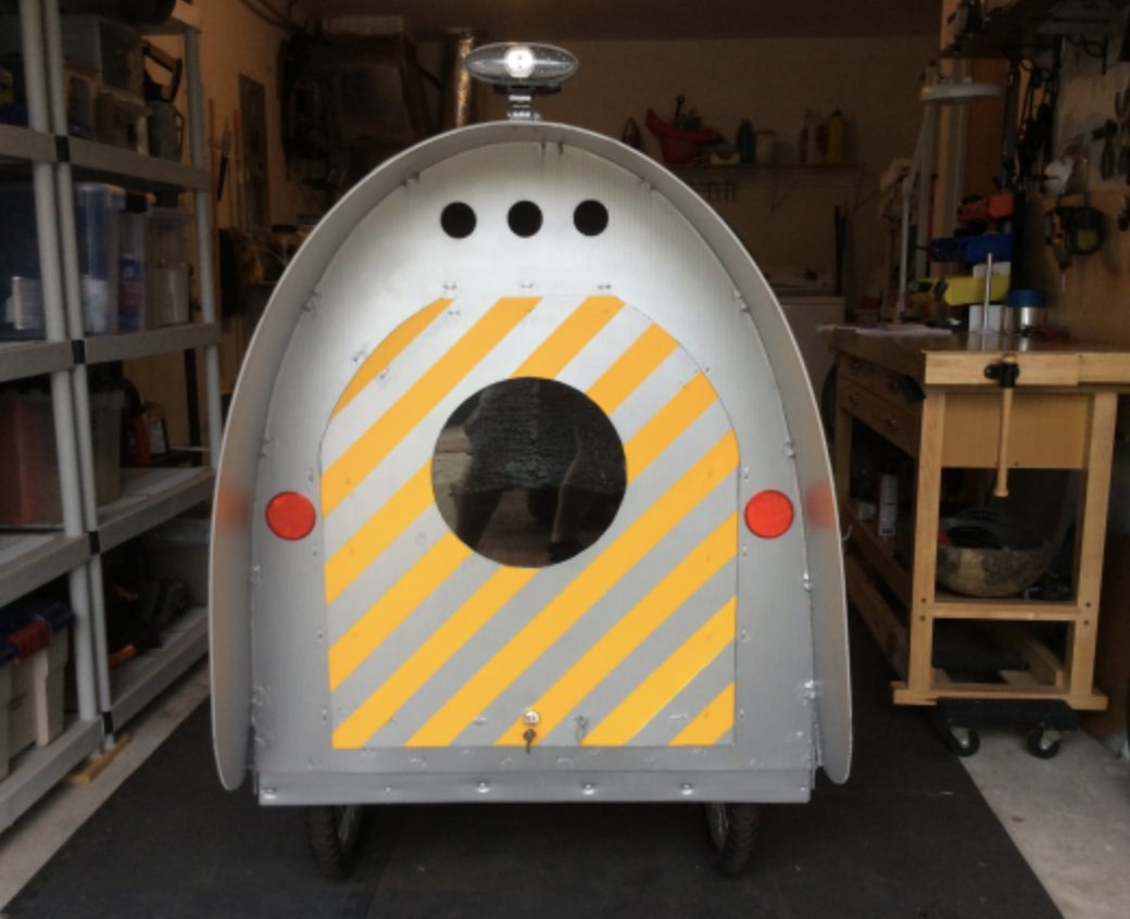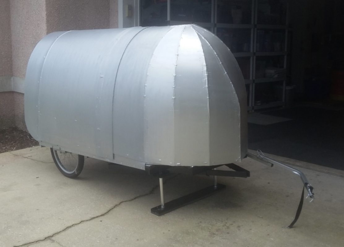 ‘I colored the shell grey to resemble an airstream. Built the frame with the wheels more toward the rear. I also put some extra support in the frame where I’ll lay. I also came up with different front leg supports, and salvaged a discarded tow hitch. Still need to install a window and a rear storage box, but all in all I think it came out pretty good. My trip starts on March 17th 2017.’