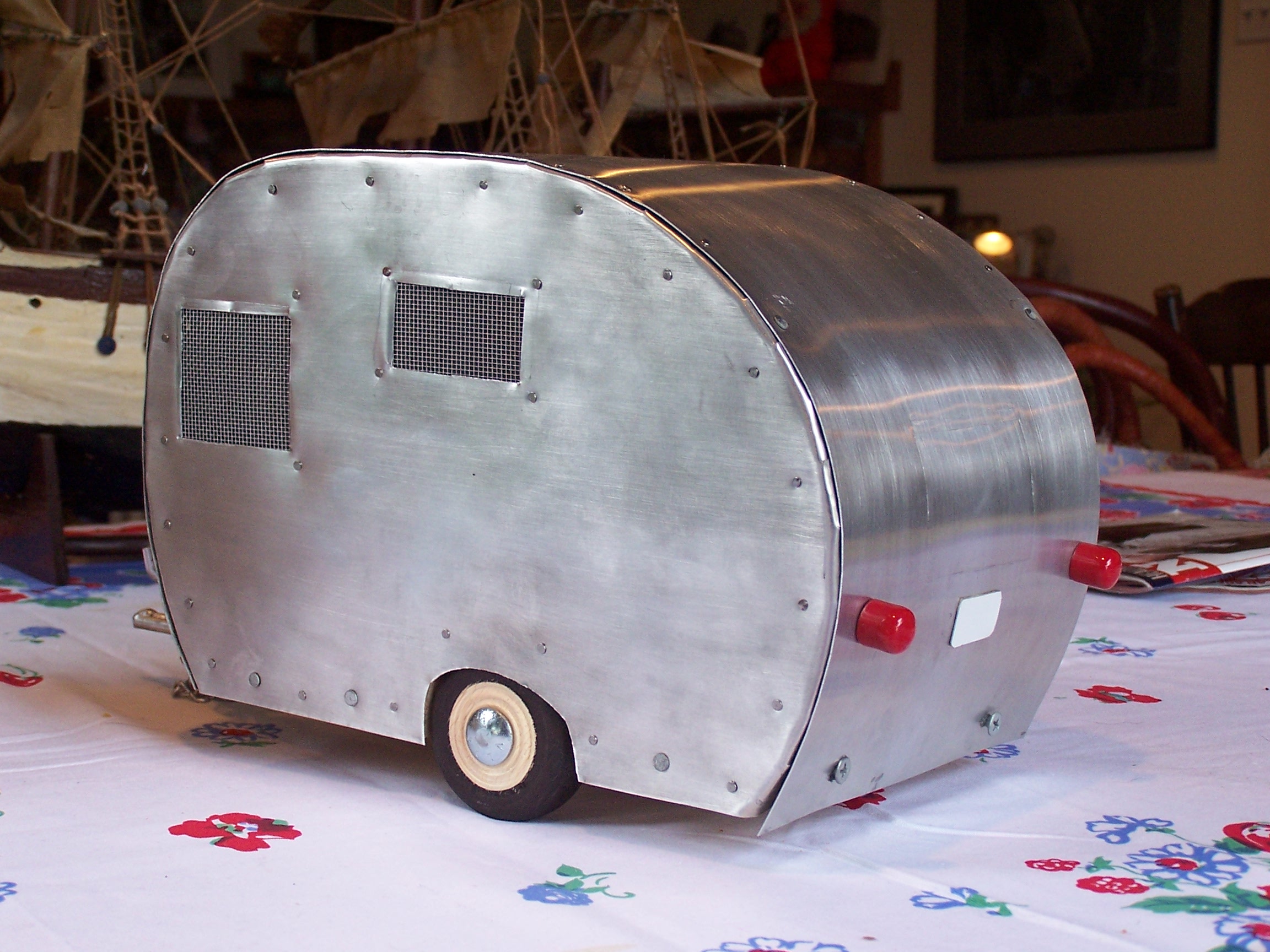 This was made using 1/2″ thick CDX plywood and aluminum sheeting. I made the wheels by cutting out plugs from a 3/4″ board using a 2-1/4″ hole saw,
